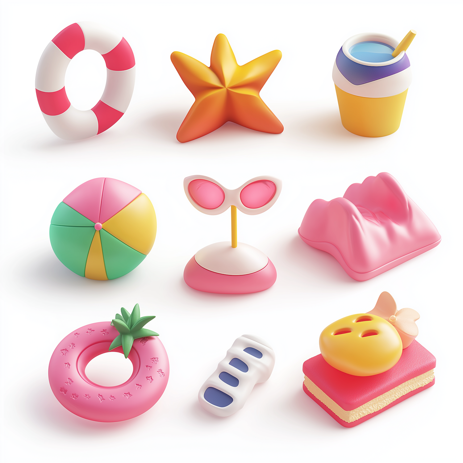 Bright 3D summer-themed objects like a lifebuoy, starfish, beach ball, and more in vibrant colors, perfect for a playful vibe.