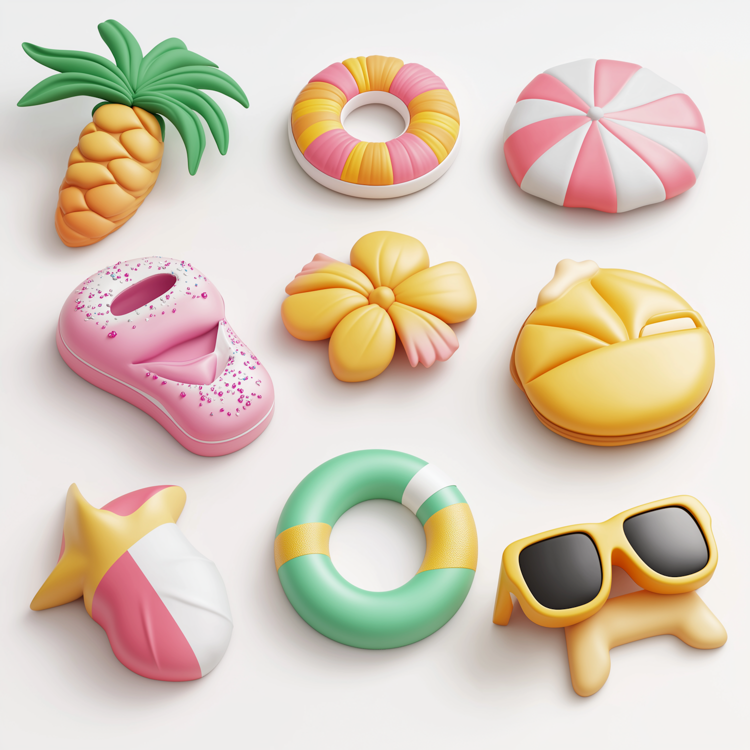 Bright 3D summer-themed objects like floats, sunglasses, and a pineapple in pastel colors, perfect for a fun, tropical vibe.