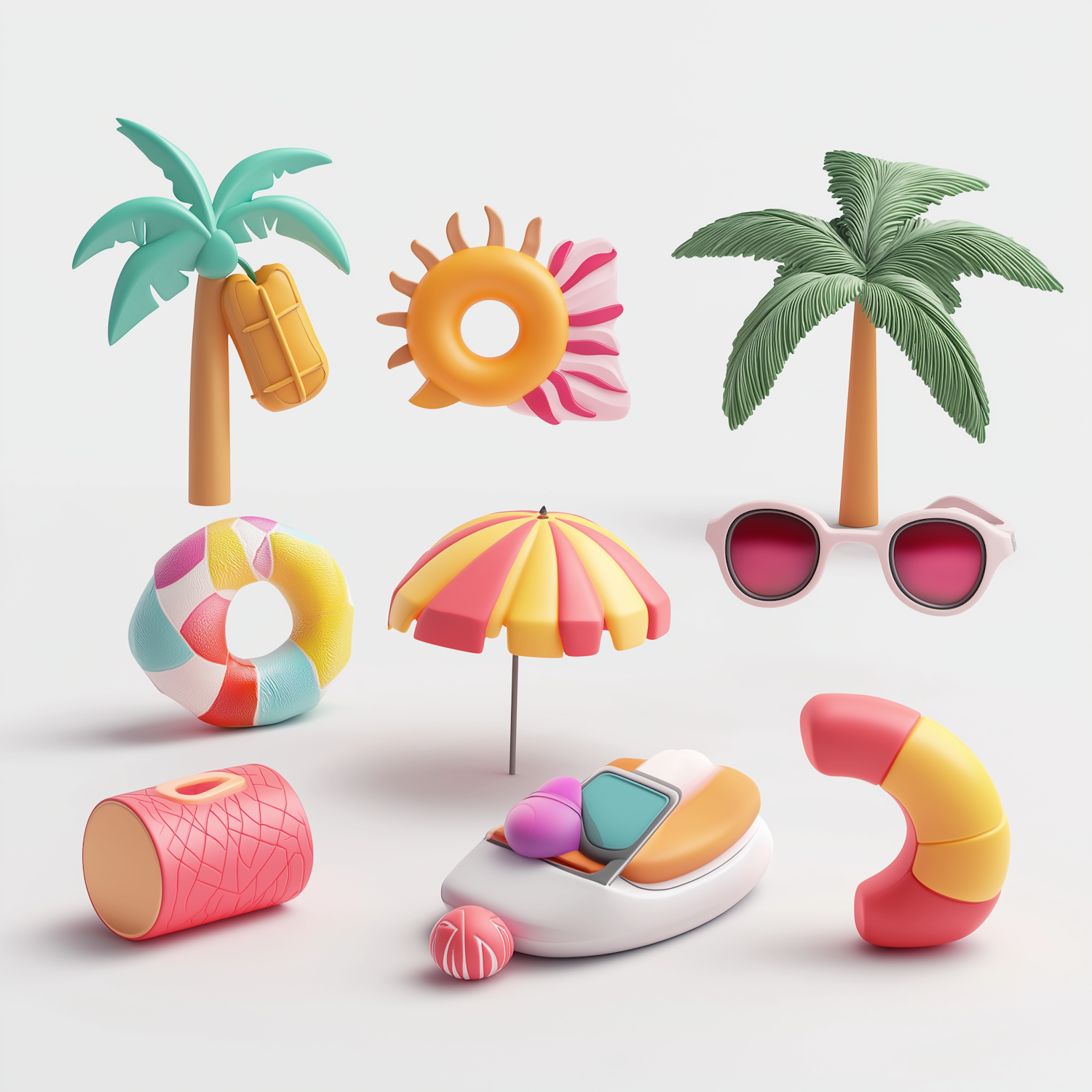 Playful 3D summer-themed objects like palm trees, floats, sunglasses, and a speedboat in vibrant colors on a white background.