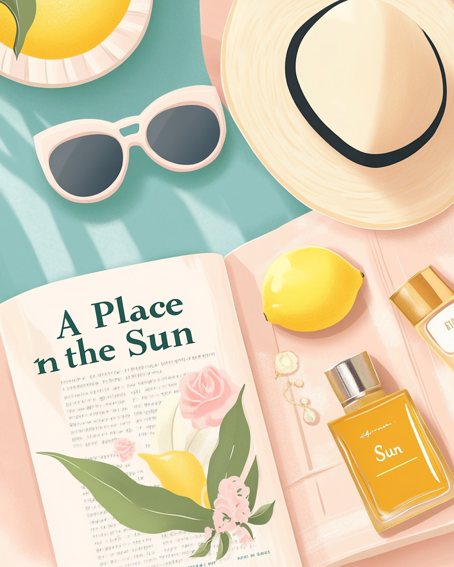 Summery illustration with a straw hat, sunglasses, lemon, perfume, and a magazine titled 'A Place in the Sun.'