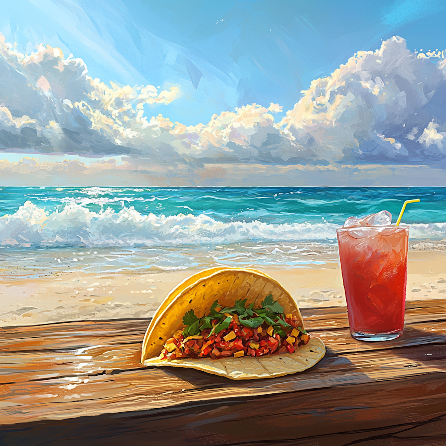 Illustration of a taco and iced drink on a wooden table by the beach, with waves and a sunny sky creating a tropical vibe.