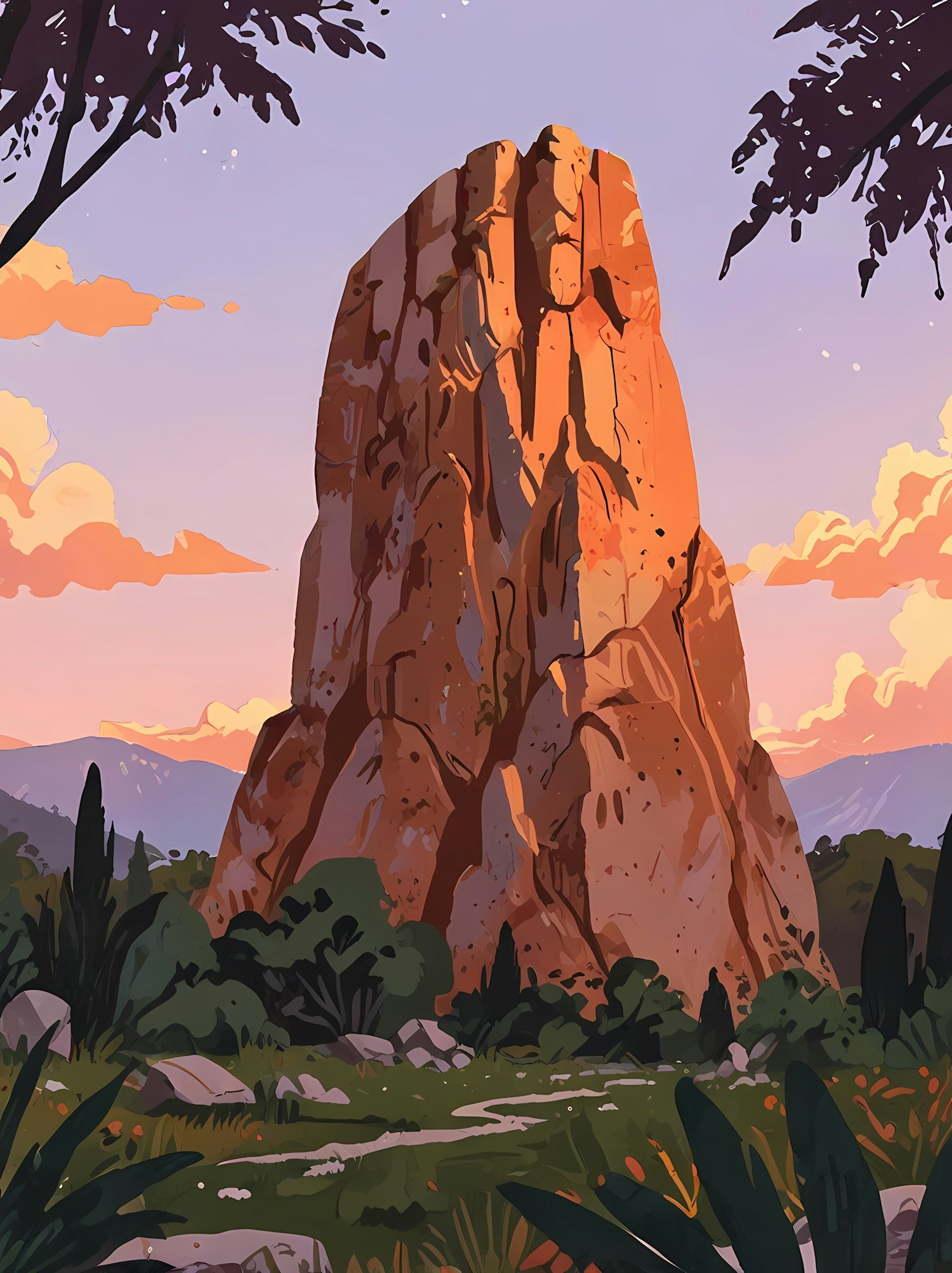A stunning illustration of a towering rock formation at sunset, surrounded by lush greenery and a serene, colorful sky.