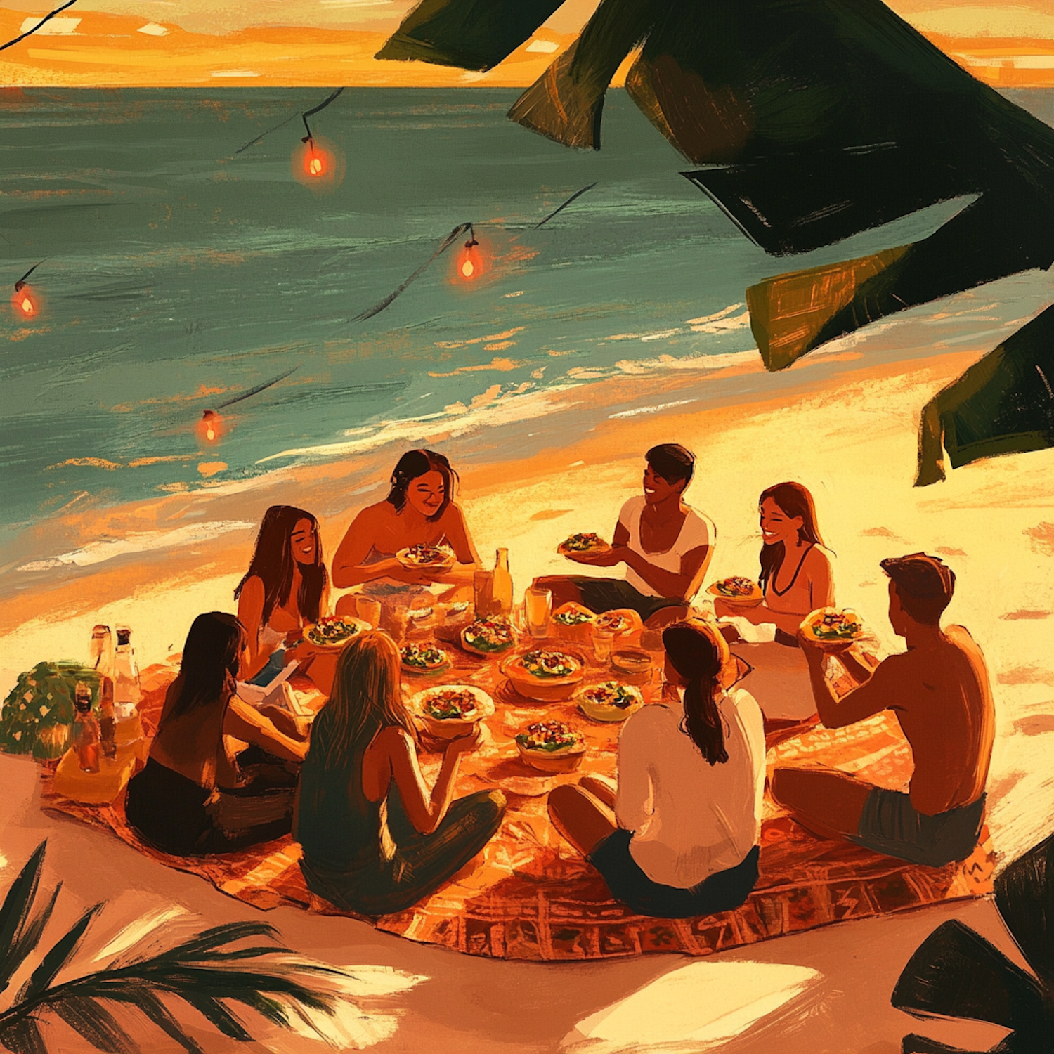 A group of friends enjoying a sunset beach picnic with food and drinks, surrounded by string lights and ocean waves.