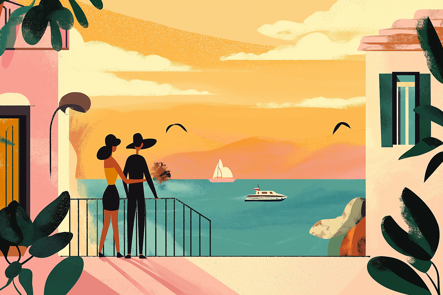 Romantic seaside illustration of a couple on a balcony at sunset, with boats, birds, and Mediterranean-style architecture.