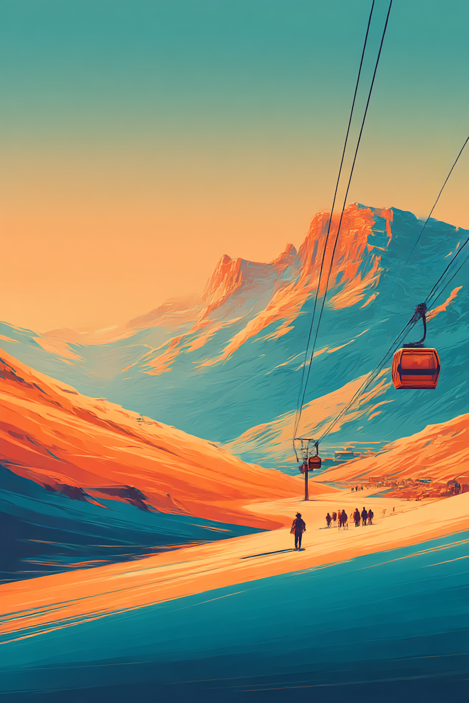 A stunning illustration of a sunset-lit mountain scene with a ski lift and people enjoying the snowy landscape.