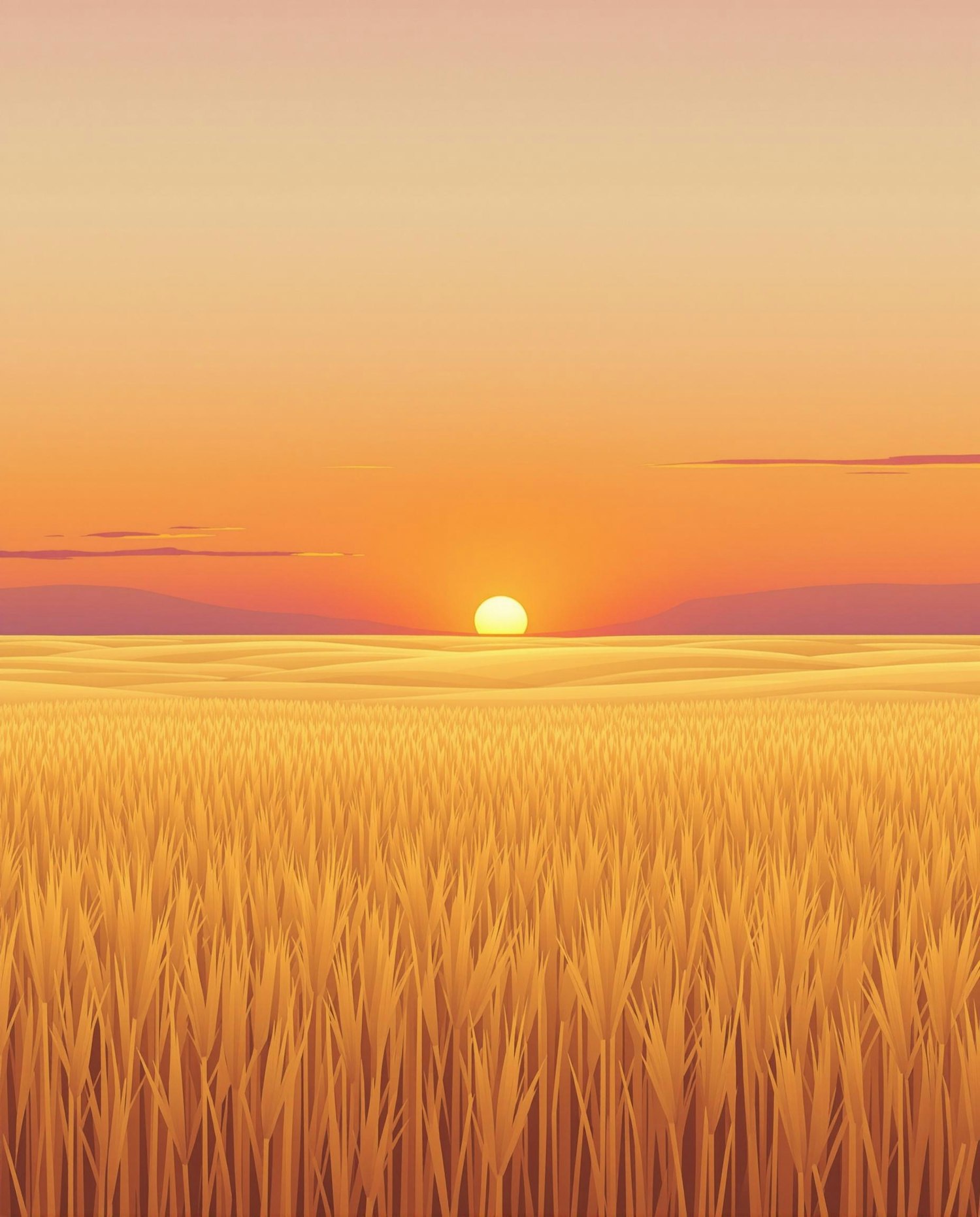 sunset over wheat field, warm golden light, minimalist horizon line, soft gradients in the sky, calming nature poster, no text
