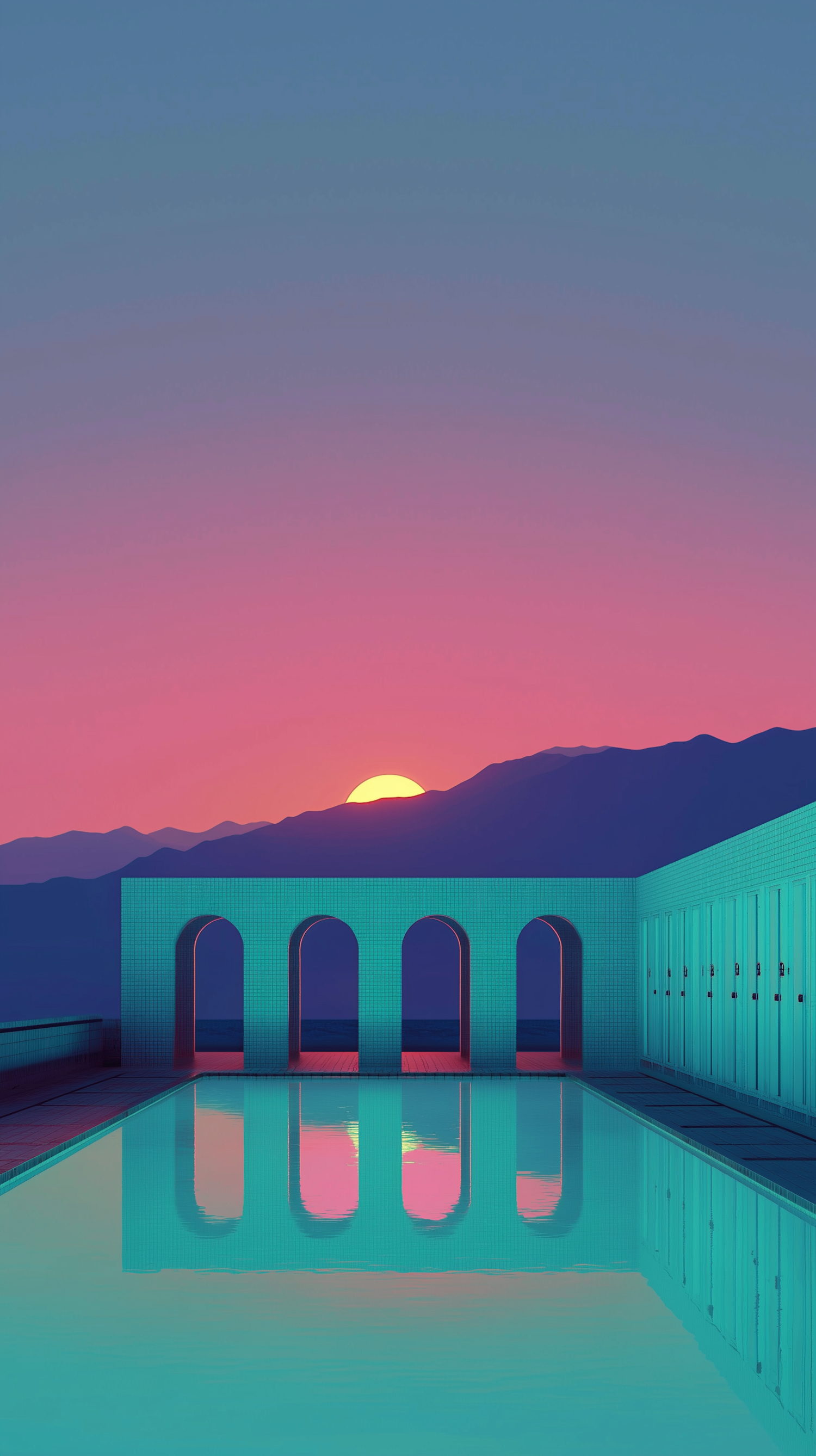 A tranquil poolside scene with turquoise arches reflecting a vibrant sunset, blending modern architecture with serene natural beauty.