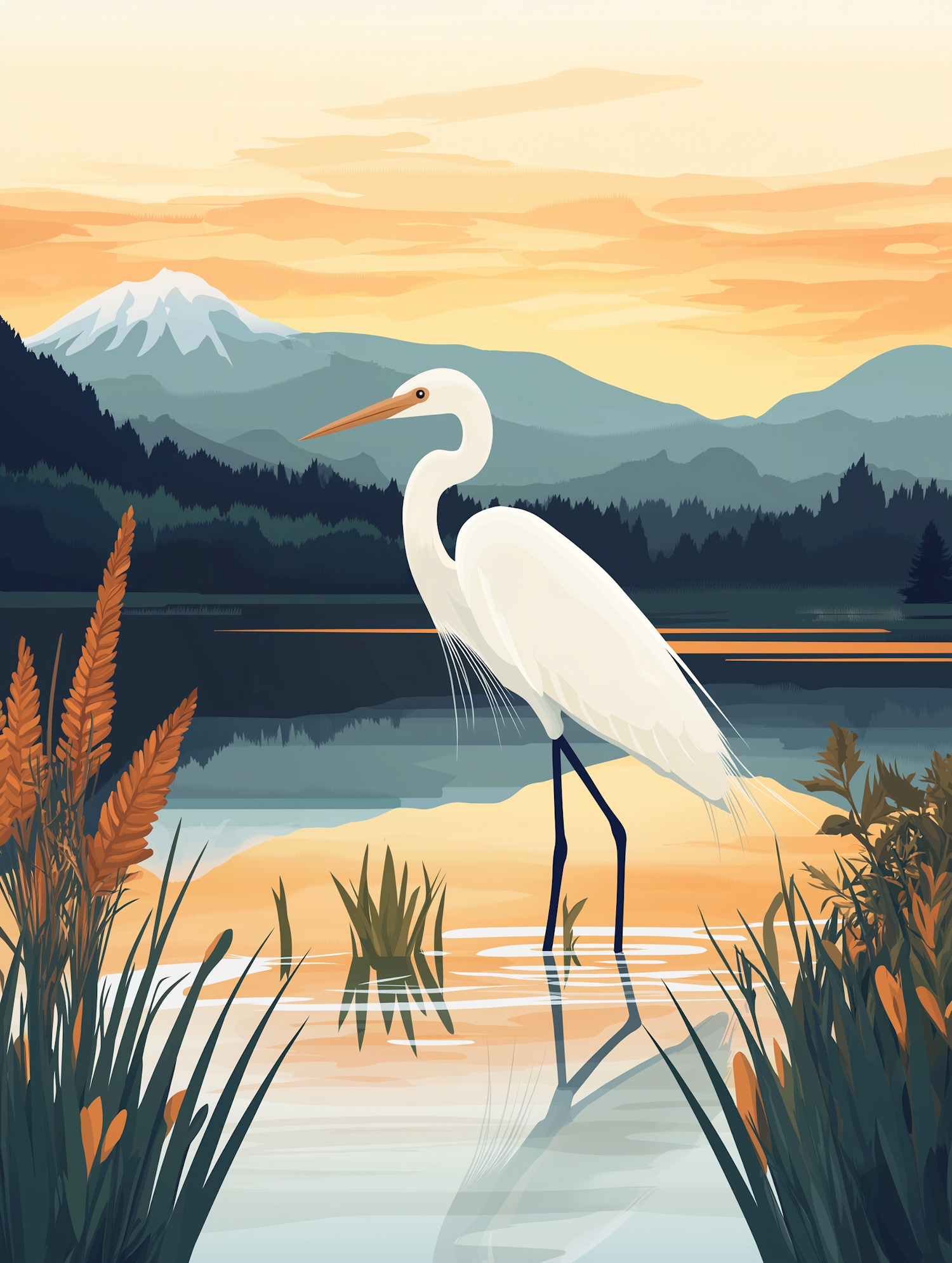 Elegant white egret in a serene landscape with mountains and a warm sky, surrounded by lush reeds and orange-tipped plants.