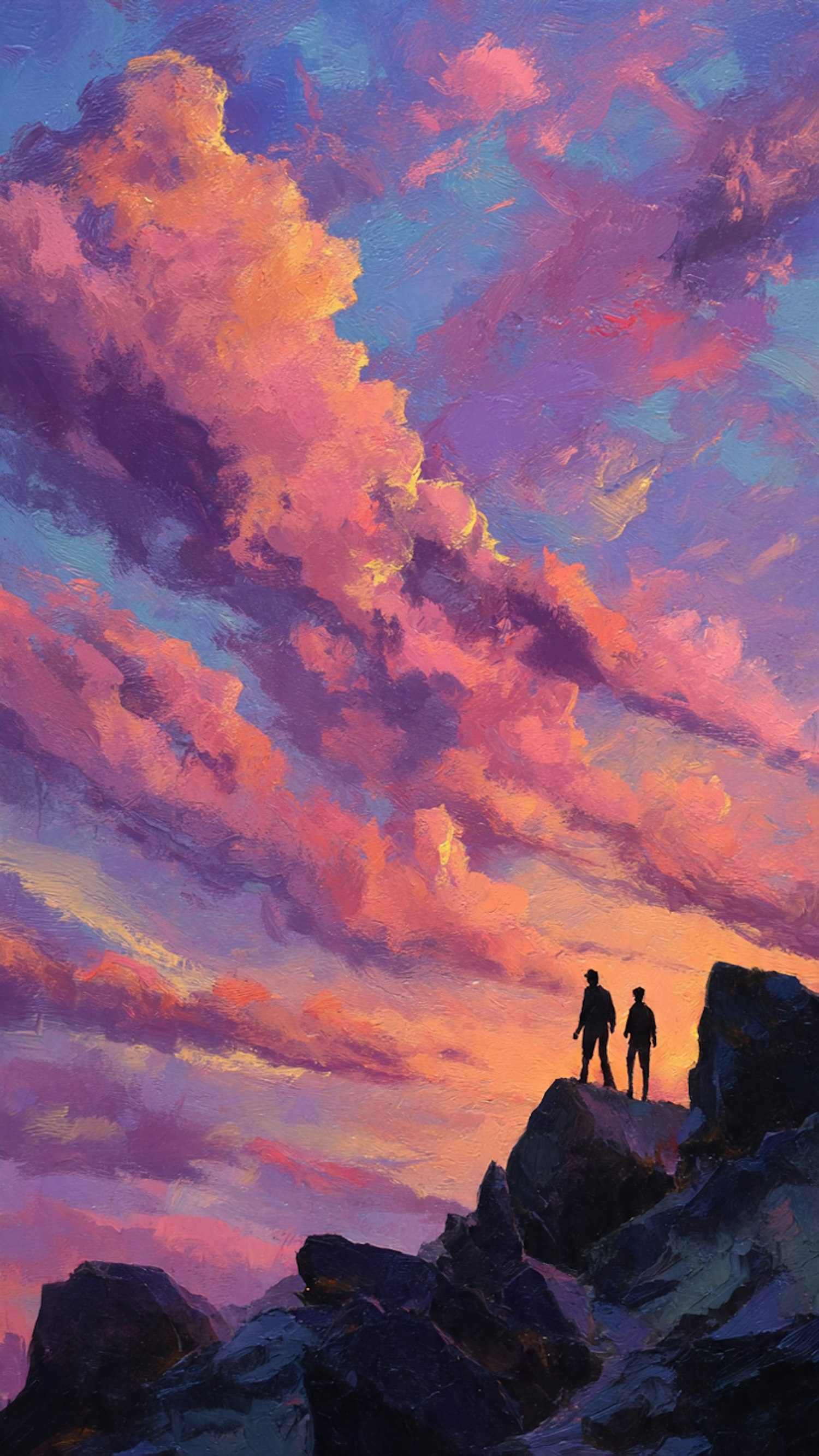 Two figures stand on a rocky peak under a vibrant, colorful sky with pink and orange clouds, creating a serene and inspiring scene.