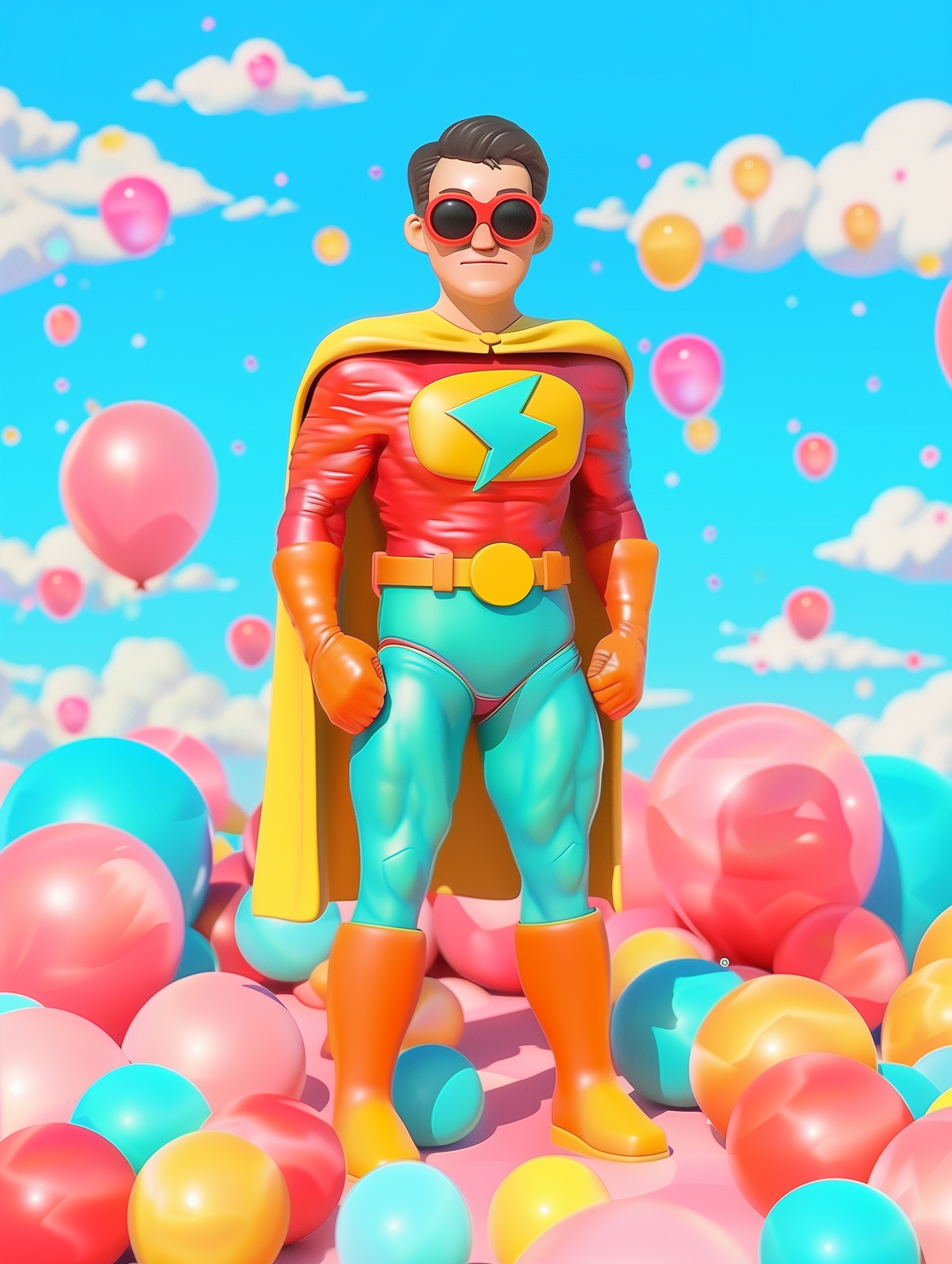 Cartoon superhero in a colorful outfit stands among balloons under a bright blue sky with clouds, exuding a playful vibe.