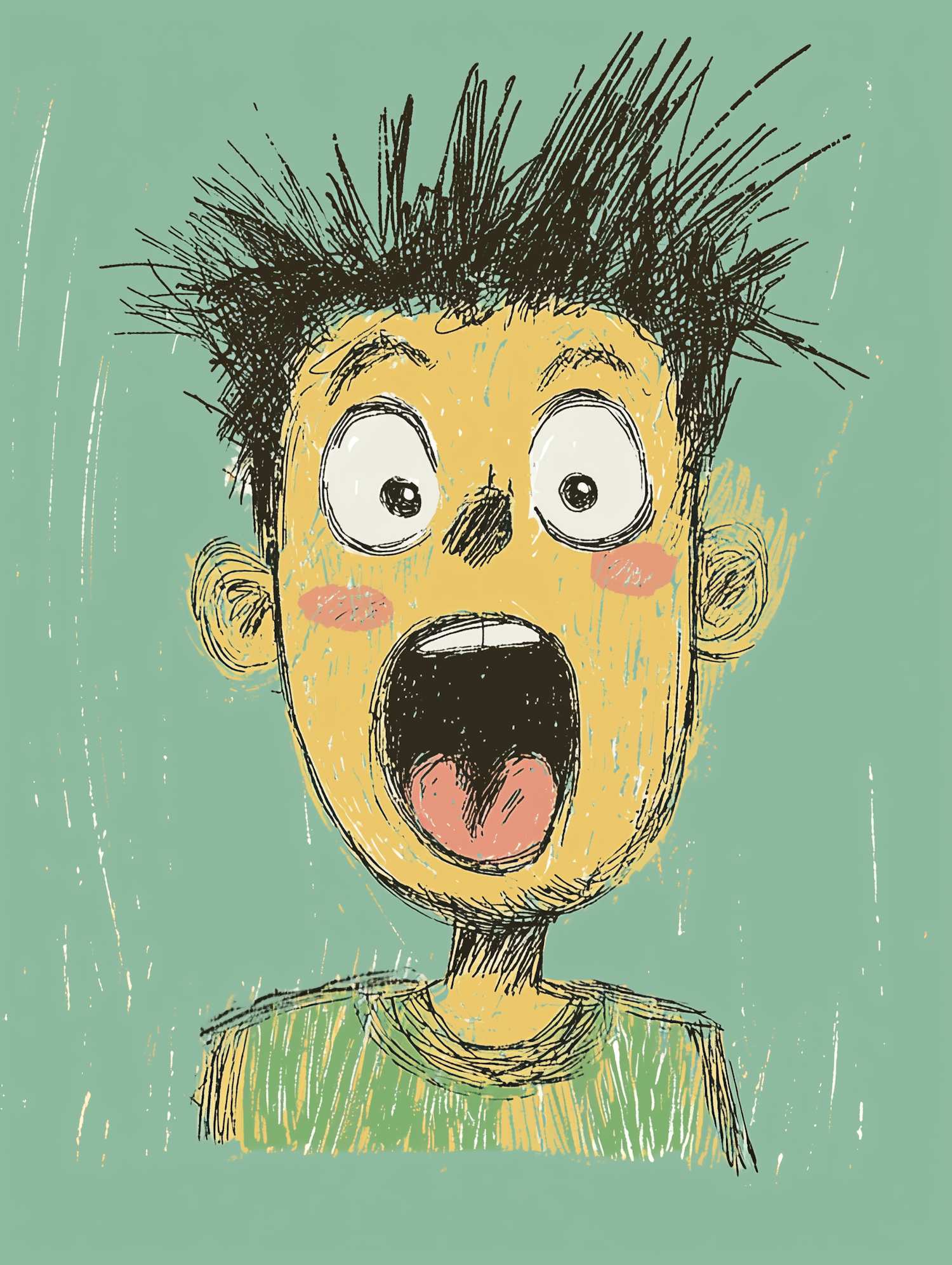 Cartoon illustration of a surprised boy with spiky hair, wide eyes, and open mouth on a green background.