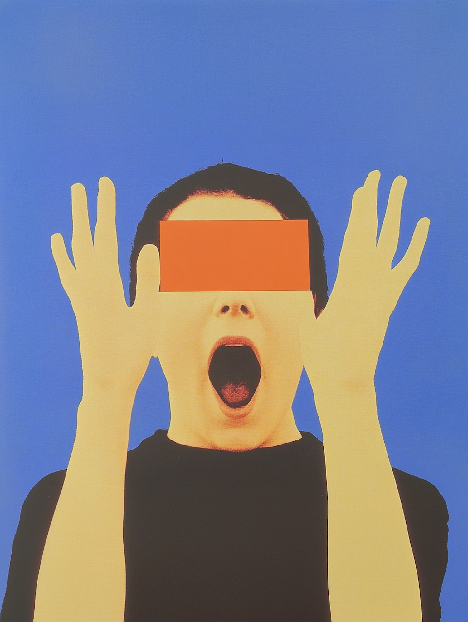 Stylized illustration of a surprised person with a red rectangle over eyes, set against a bright blue background.