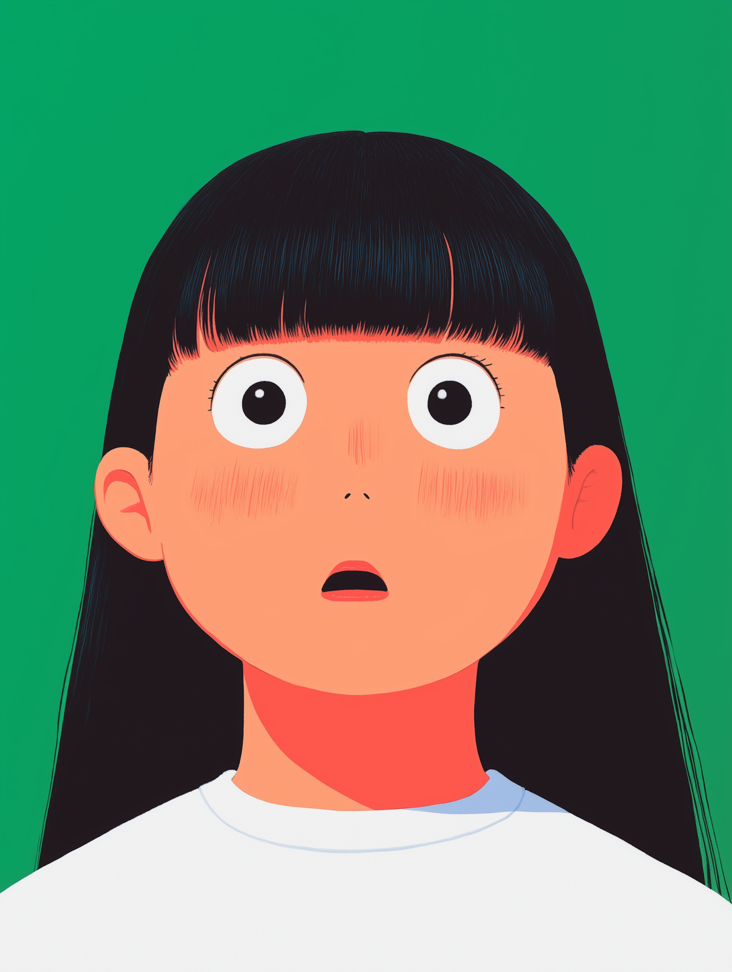 Cartoon girl with long black hair and surprised expression against a green background. Bold, simplistic style with clean lines.