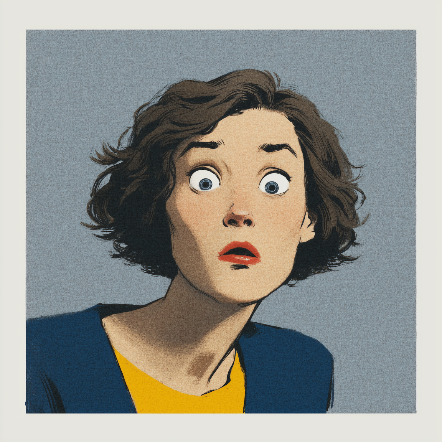 Stylized illustration of a surprised woman with short brown hair, wide blue eyes, and a blue and yellow outfit against a gray background.