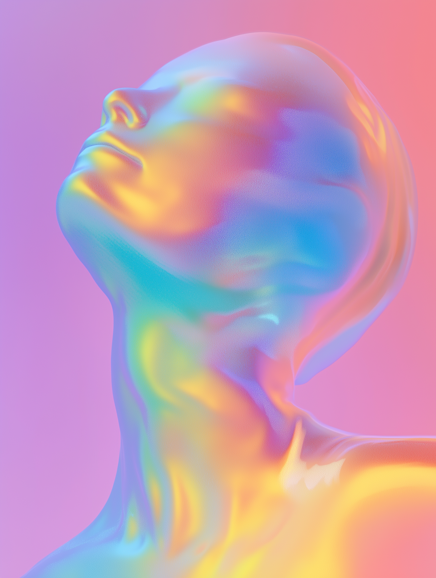 A vibrant 3D-rendered figure with an iridescent gradient finish, set against a soft pink and purple background. Abstract and ethereal.