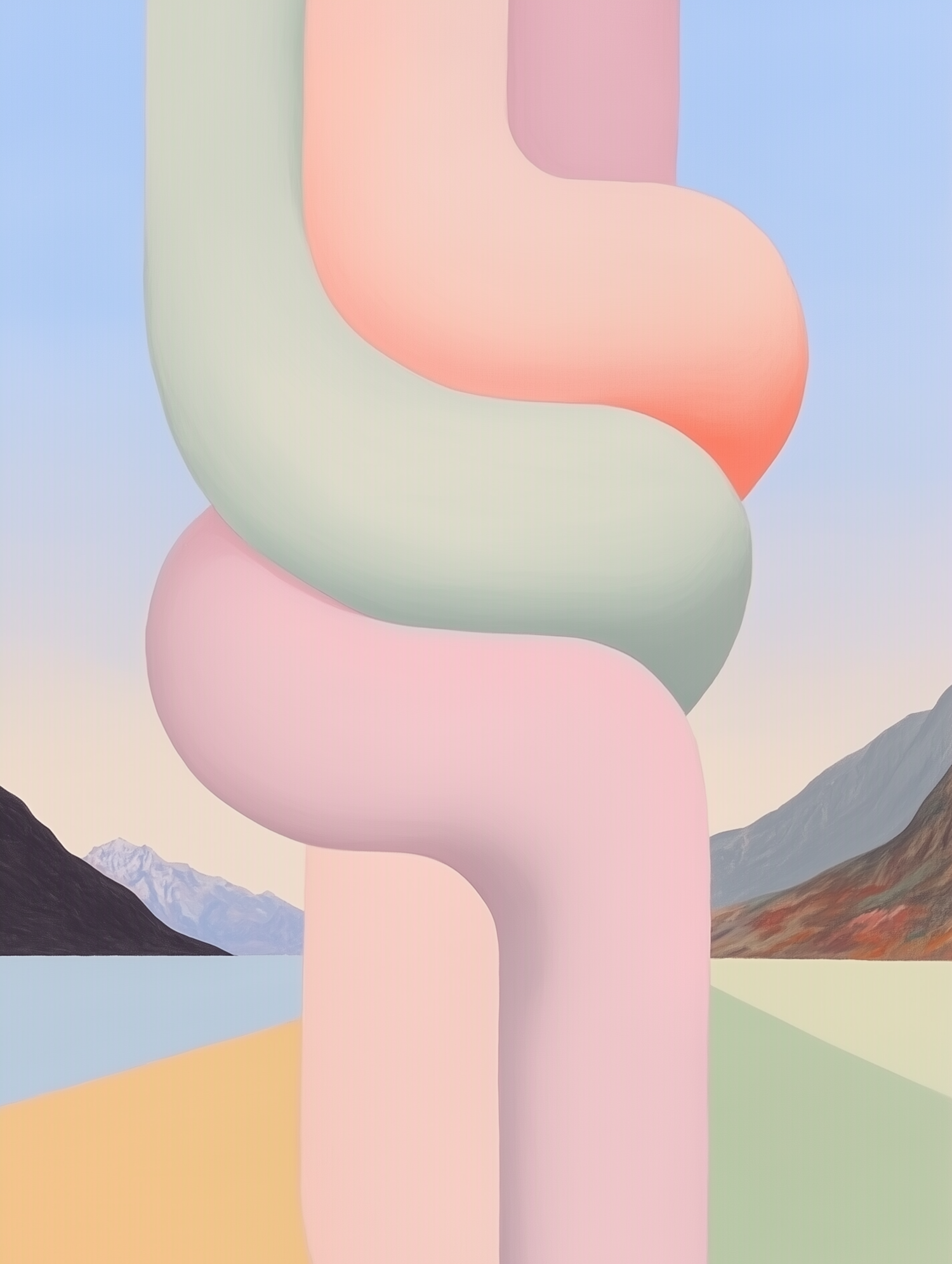 Abstract pastel tubular shapes intertwine against a serene backdrop of mountains, a lake, and a clear blue sky.