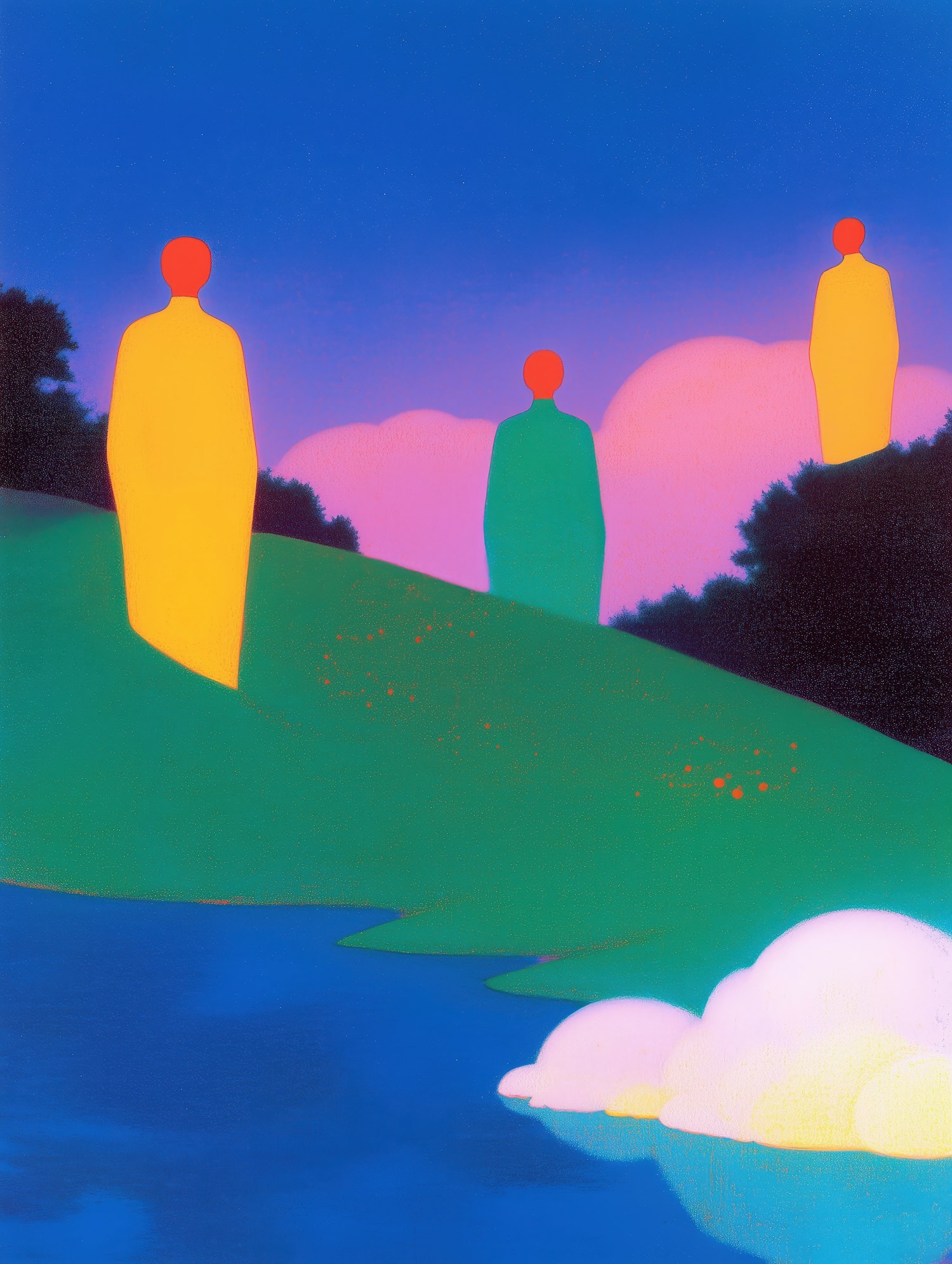 Surreal illustration of abstract figures on a hill with a vibrant gradient sky, pink clouds, and reflective water in the foreground.