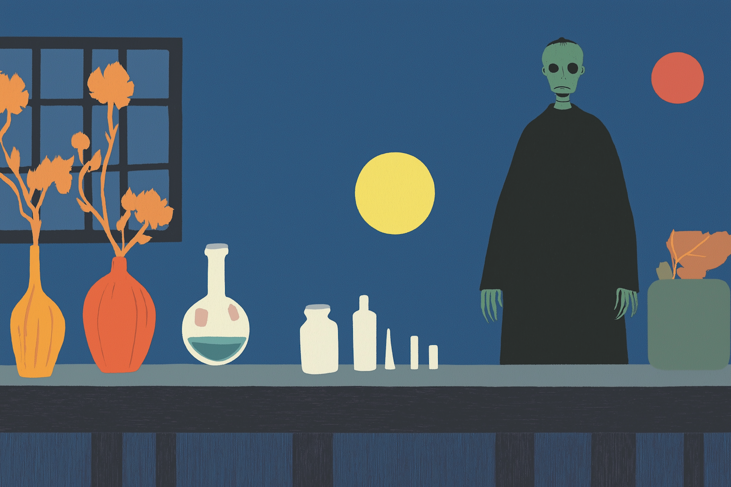 Surreal scene with a faceless figure, celestial motifs, and abstract floral arrangements in muted tones, creating an eerie atmosphere.