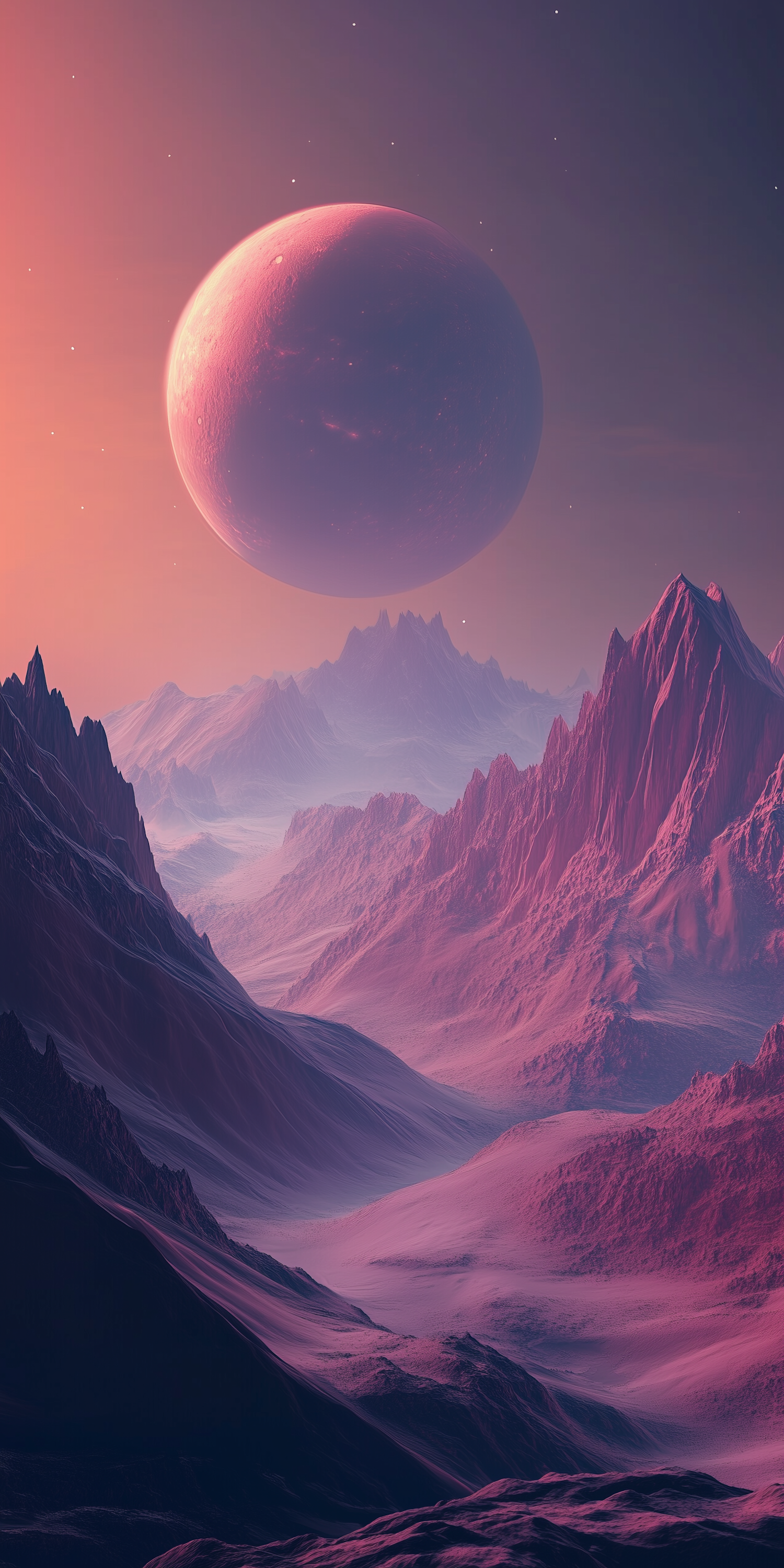 A stunning alien landscape with pink mountains and a massive planet in the sky, creating a surreal and otherworldly vibe.