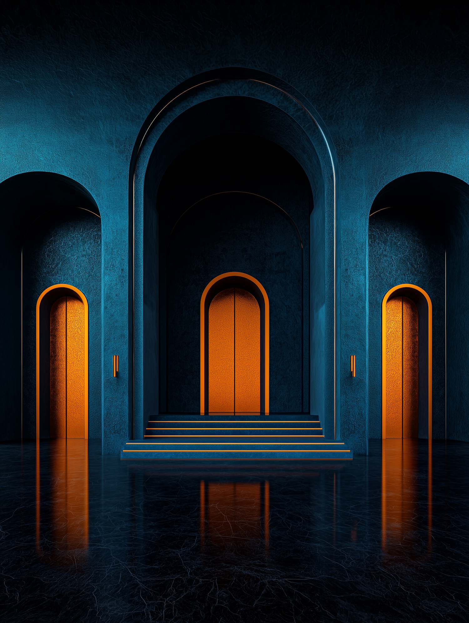 A surreal, futuristic interior with glowing orange arches, deep blue walls, and reflective black marble floors. Striking and mysterious.