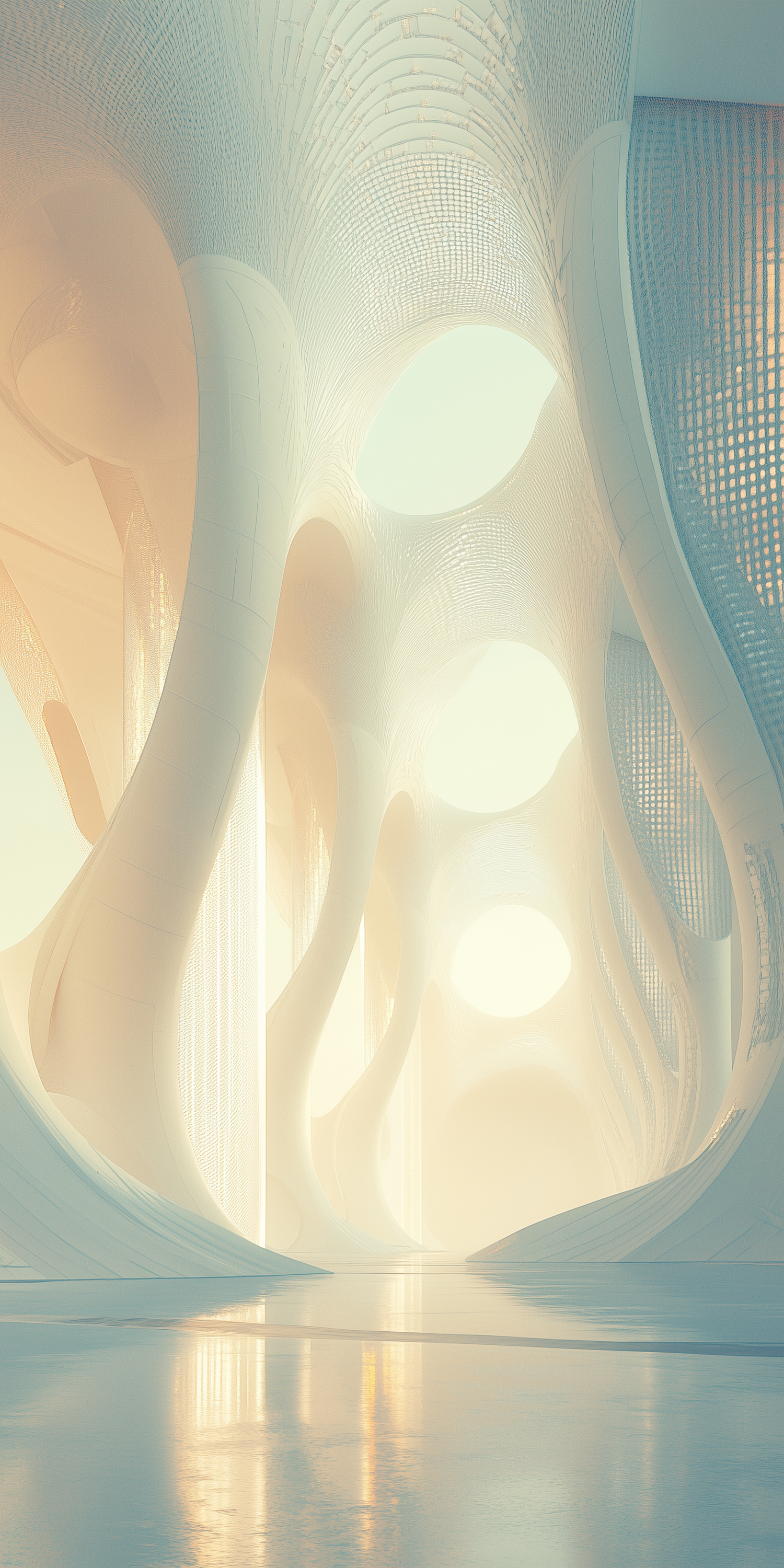 A futuristic, ethereal architectural space with organic columns, glowing light, and a serene, dreamlike atmosphere.