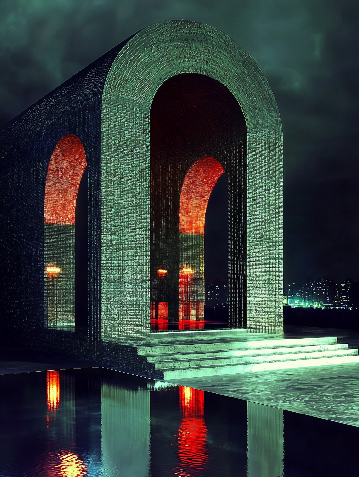 A glowing arched structure with green walls and red lighting reflects on water, set against a dark sky and distant city lights.