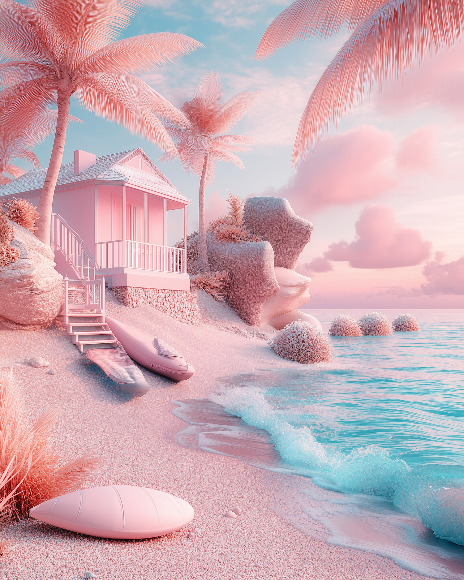Dreamy pastel beach scene with pink sand, turquoise waves, and a charming house surrounded by pink palm trees. Perfectly surreal vibes.