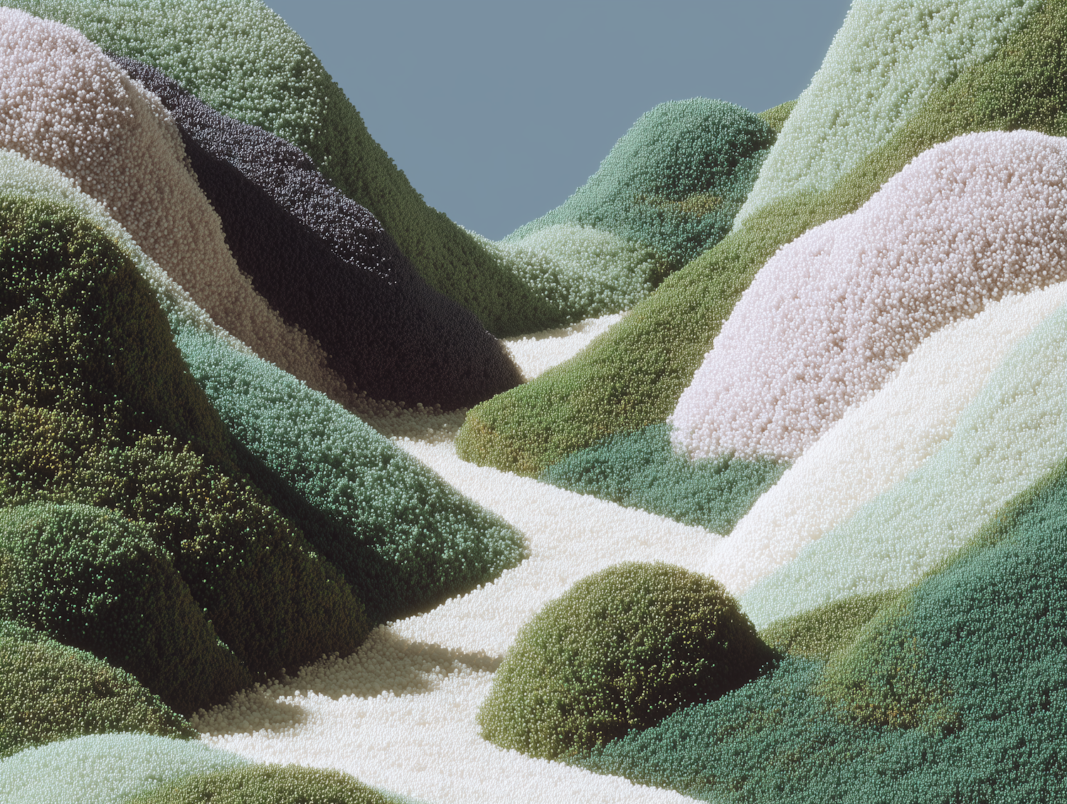 A surreal landscape of textured, bead-like hills in green, white, and black tones against a muted blue background.