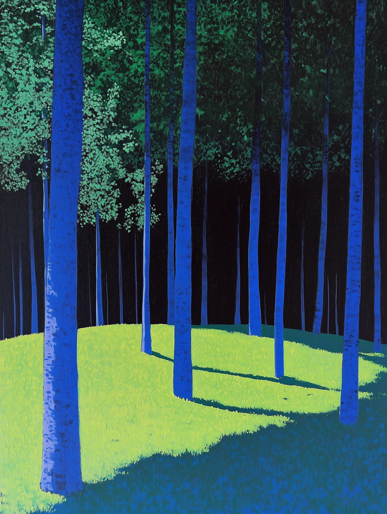 A surreal forest scene with blue tree trunks, bright green grass, and dramatic light and shadow contrasts. Dreamlike and vibrant.