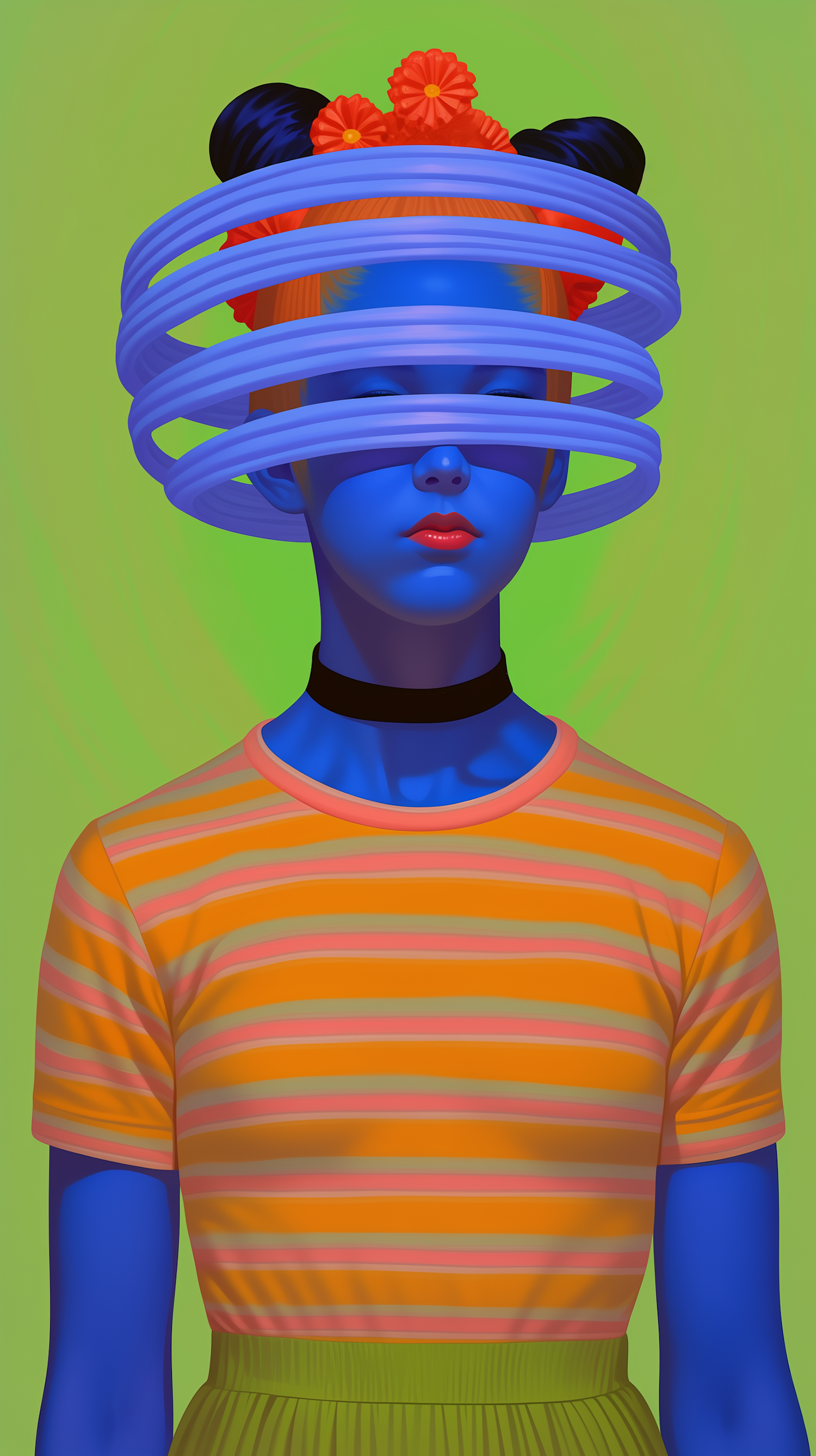 A surreal portrait of a blue-skinned individual with vibrant attire and unique headwear, set against a green gradient background.