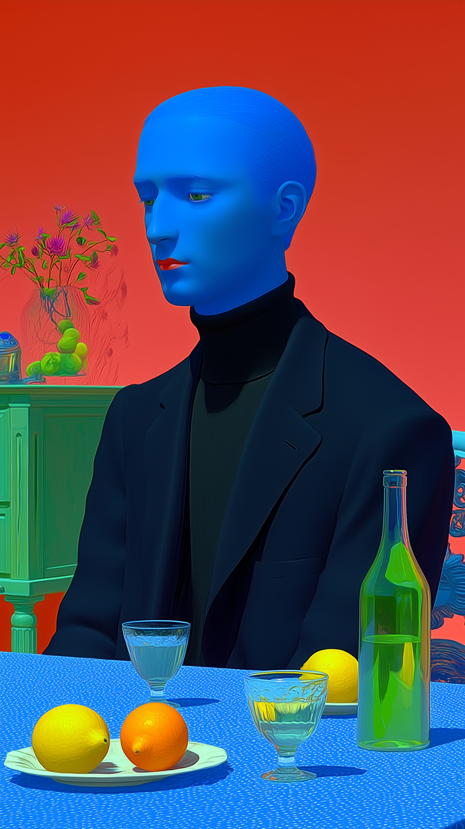 A surreal illustration of a blue-skinned figure at a table with fruit and glassware, set against a vibrant red and green background.