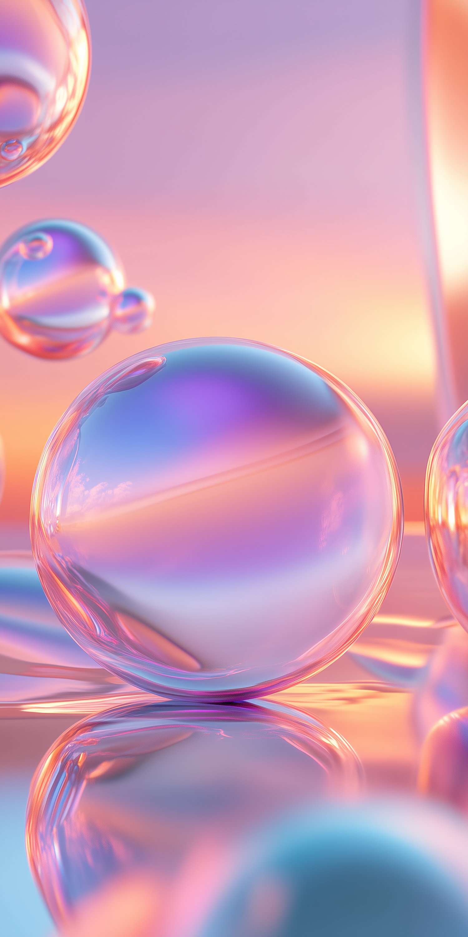Dreamy digital art of glossy, translucent bubbles reflecting sunset hues of pink, purple, and orange in a surreal, ethereal setting.