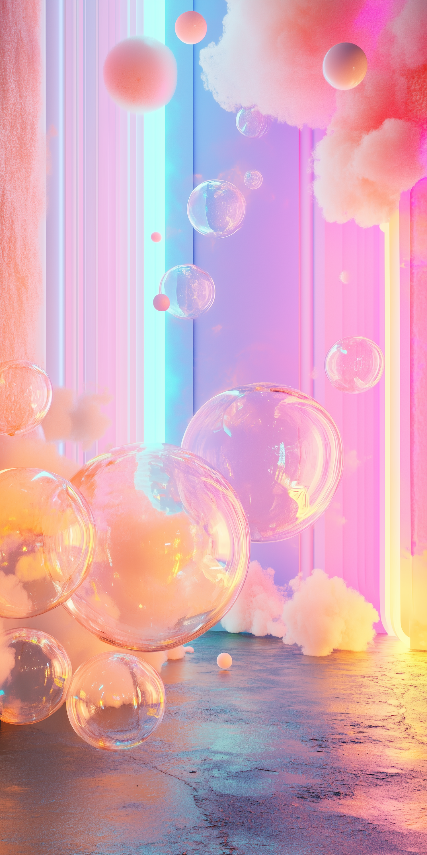 Dreamy pastel scene with glowing bubbles, neon lights, and fluffy clouds creating a surreal, futuristic atmosphere.