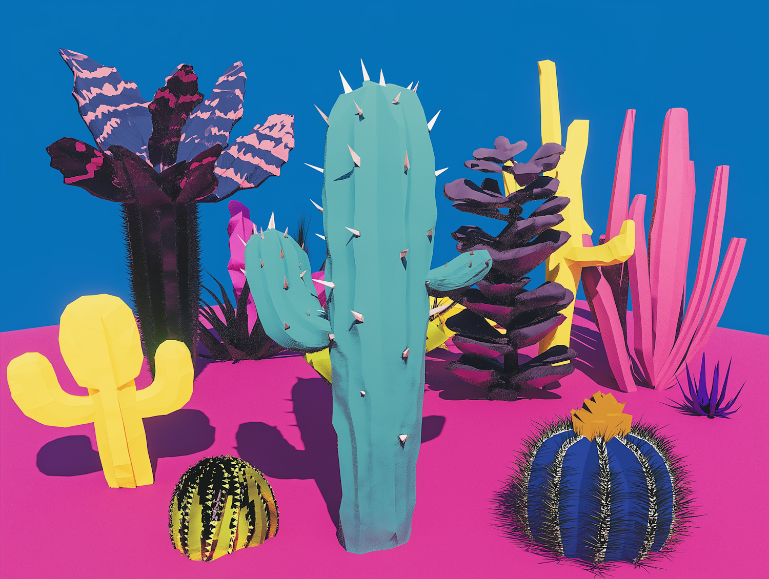 Colorful cacti illustration with vibrant pink, teal, and yellow hues against a bright blue background. Modern and artistic design.