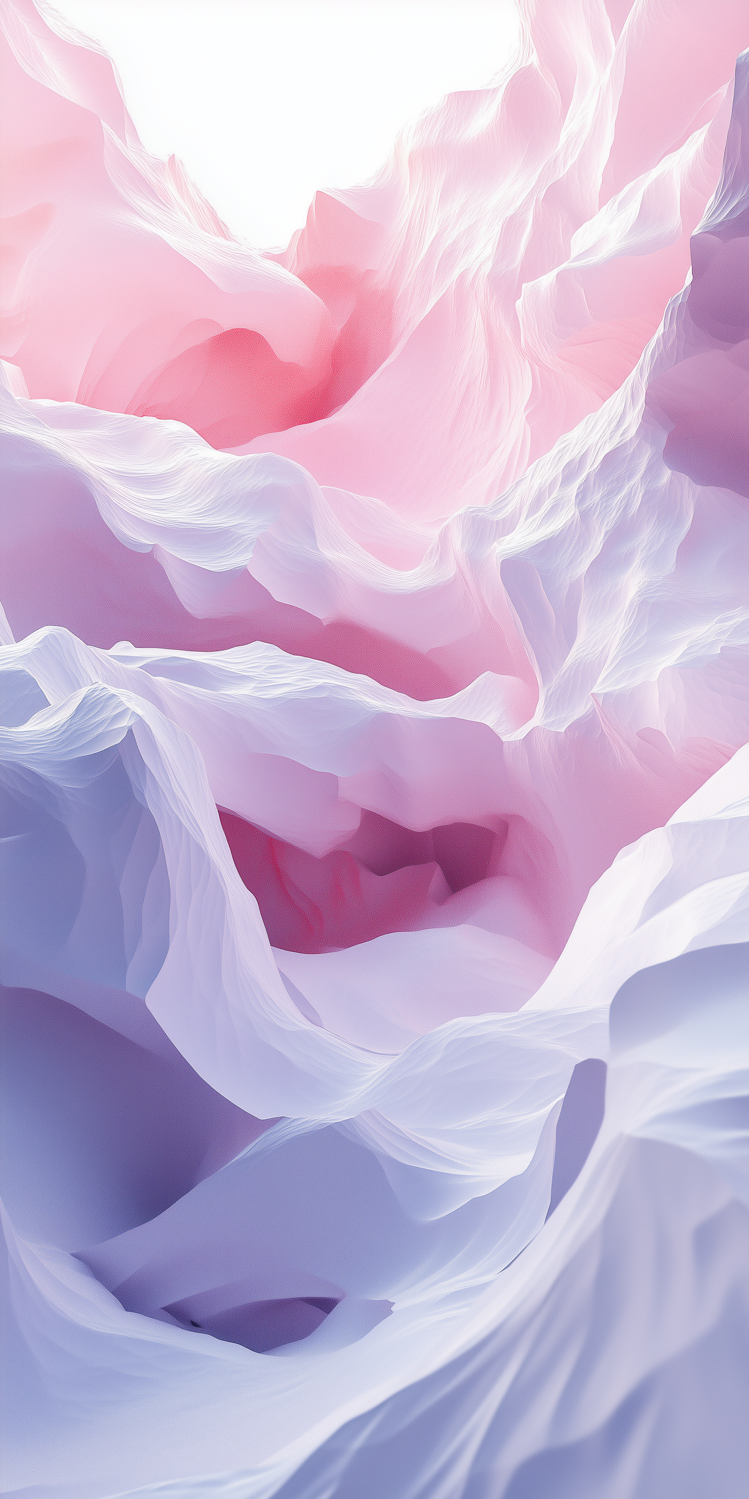 Abstract pastel artwork with flowing layers of pink, lavender, and white, resembling a dreamy canyon or fabric folds.