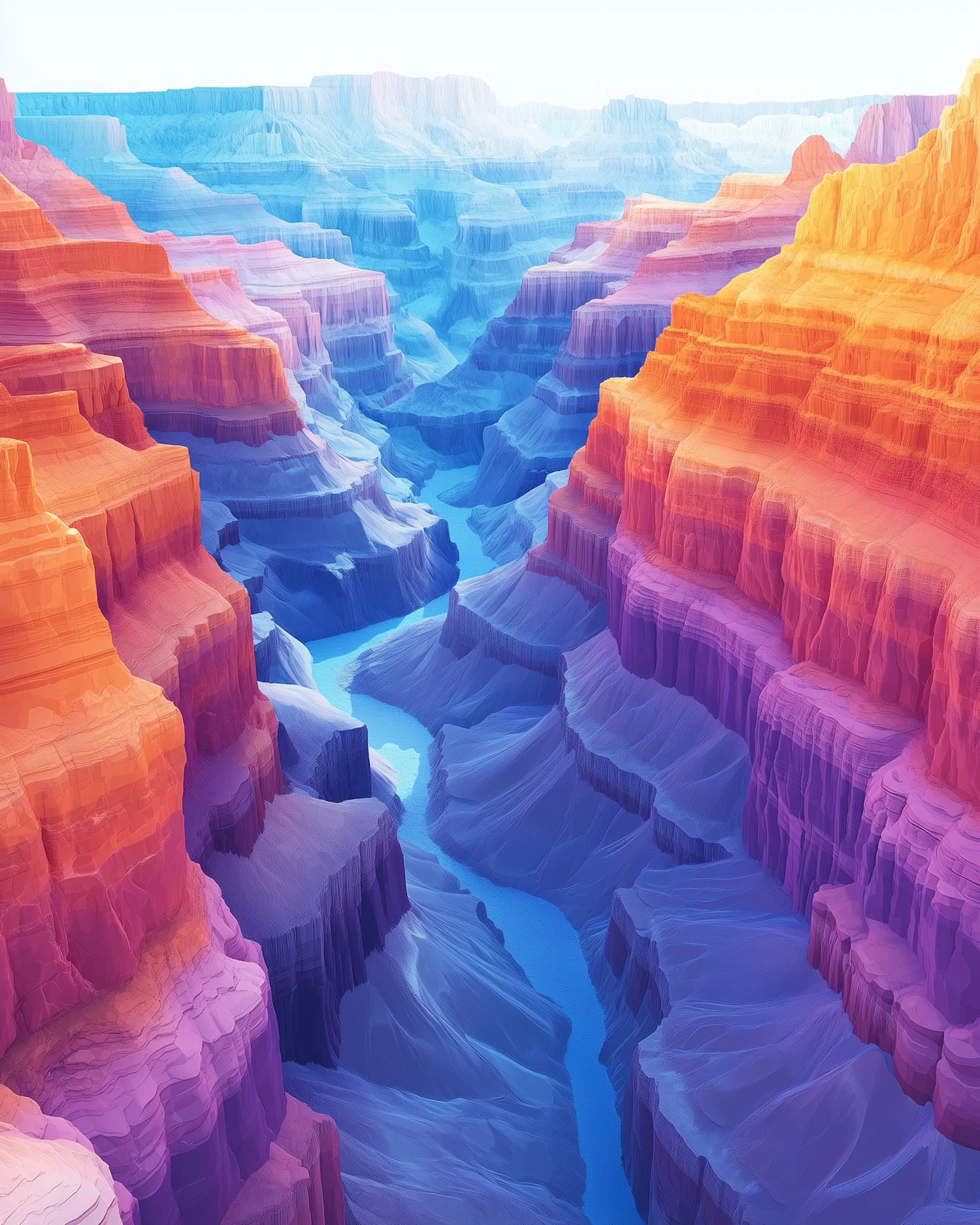 A surreal canyon illustration with vibrant orange, purple, and blue hues, featuring a winding river cutting through layered rock formations.