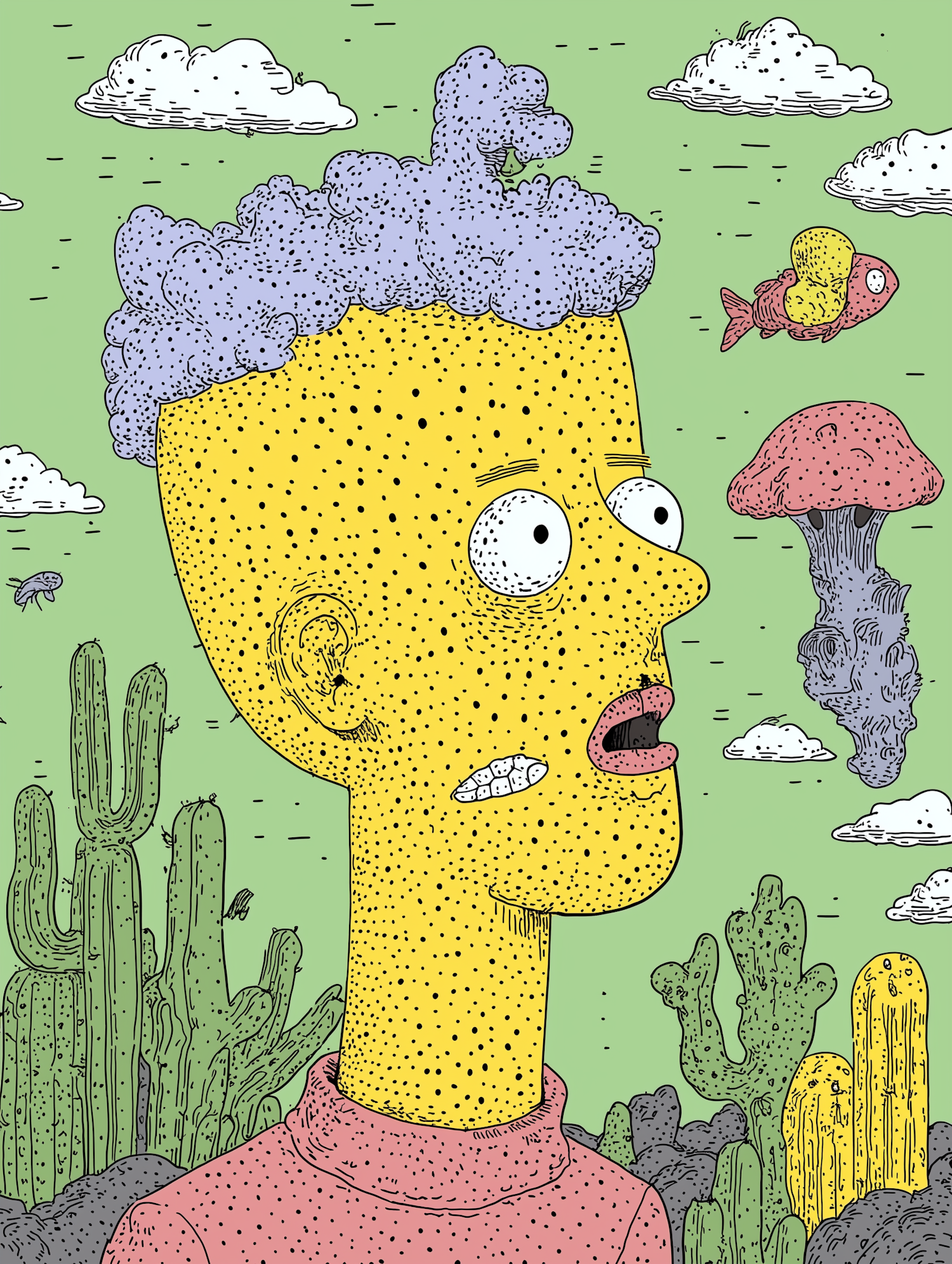 Surreal illustration of a yellow character with cloud hair, floating fish, and desert cacti on a green background.