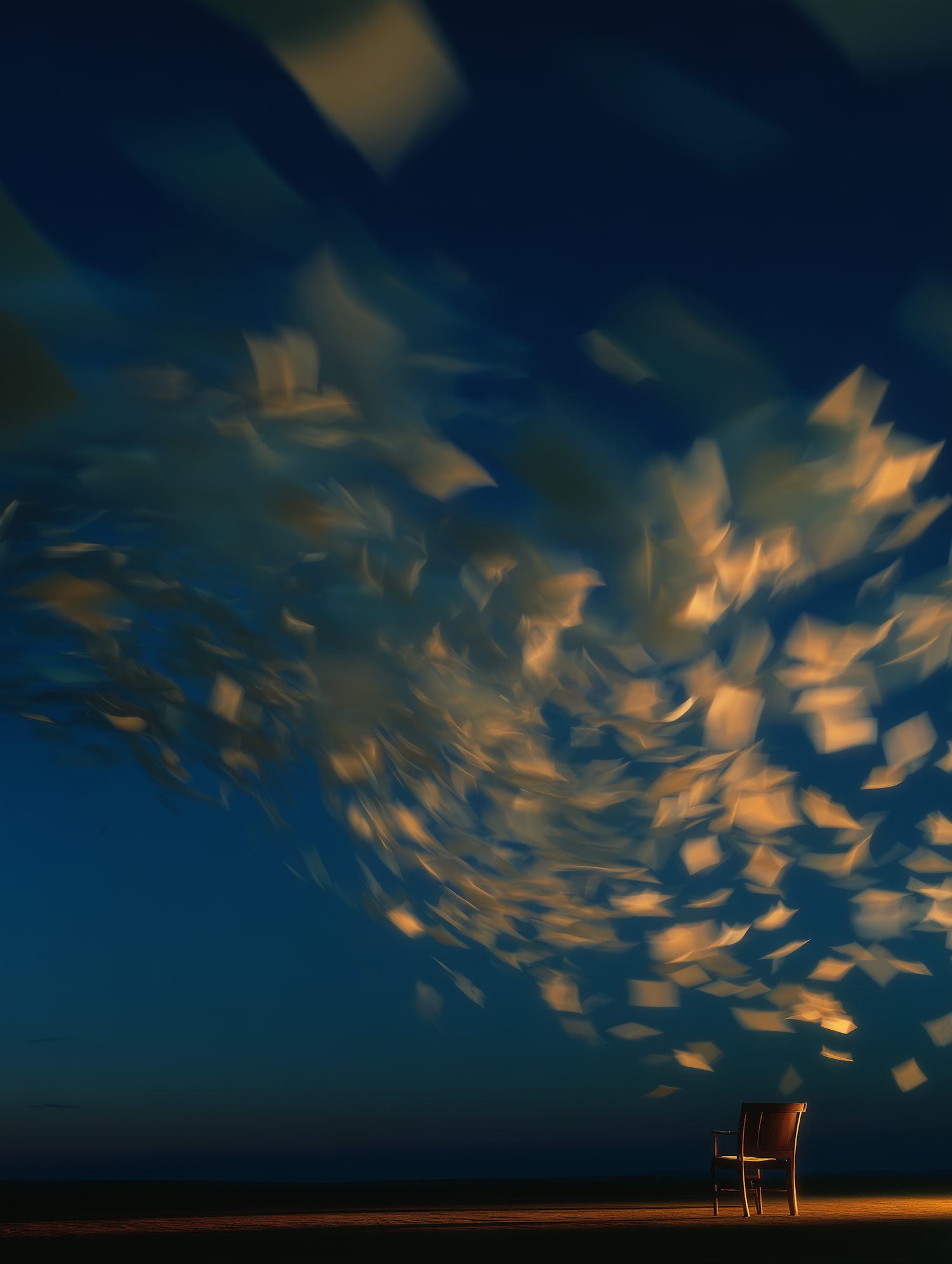 A surreal image of a chair under warm light with papers swirling dynamically against a deep blue background, evoking mystery and motion.