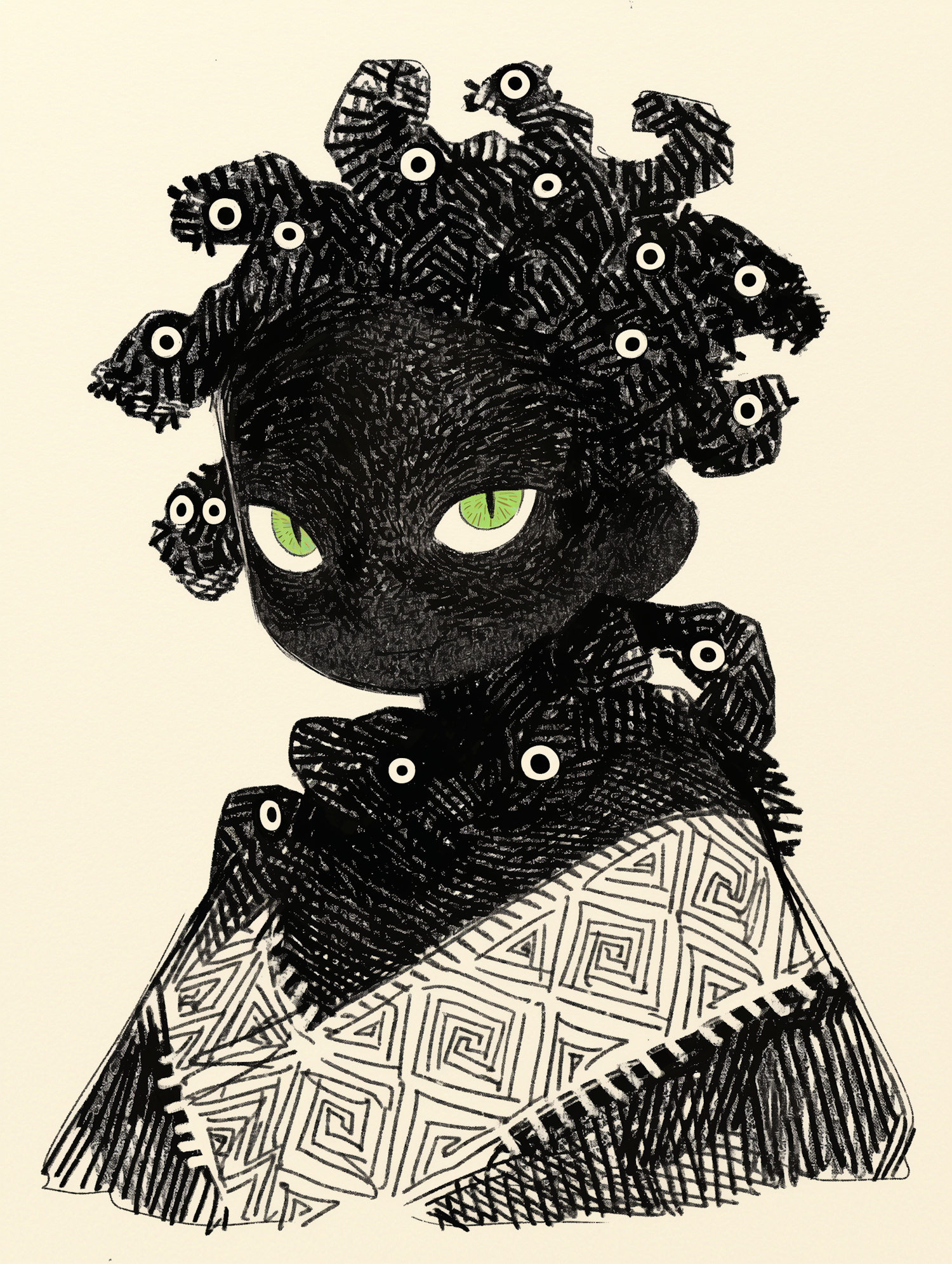 Stylized illustration of a character with textured hair, green eyes, and geometric-patterned clothing, showcasing artistic and surreal elements.