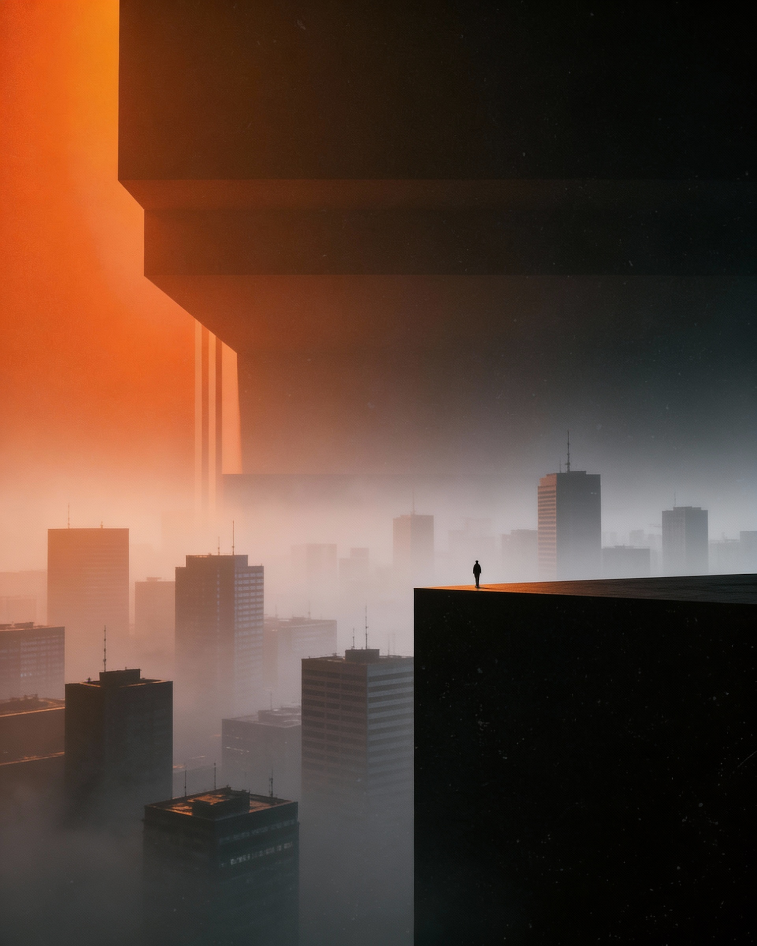 A lone figure stands on a massive structure overlooking a foggy cityscape under a dramatic orange and black sky.