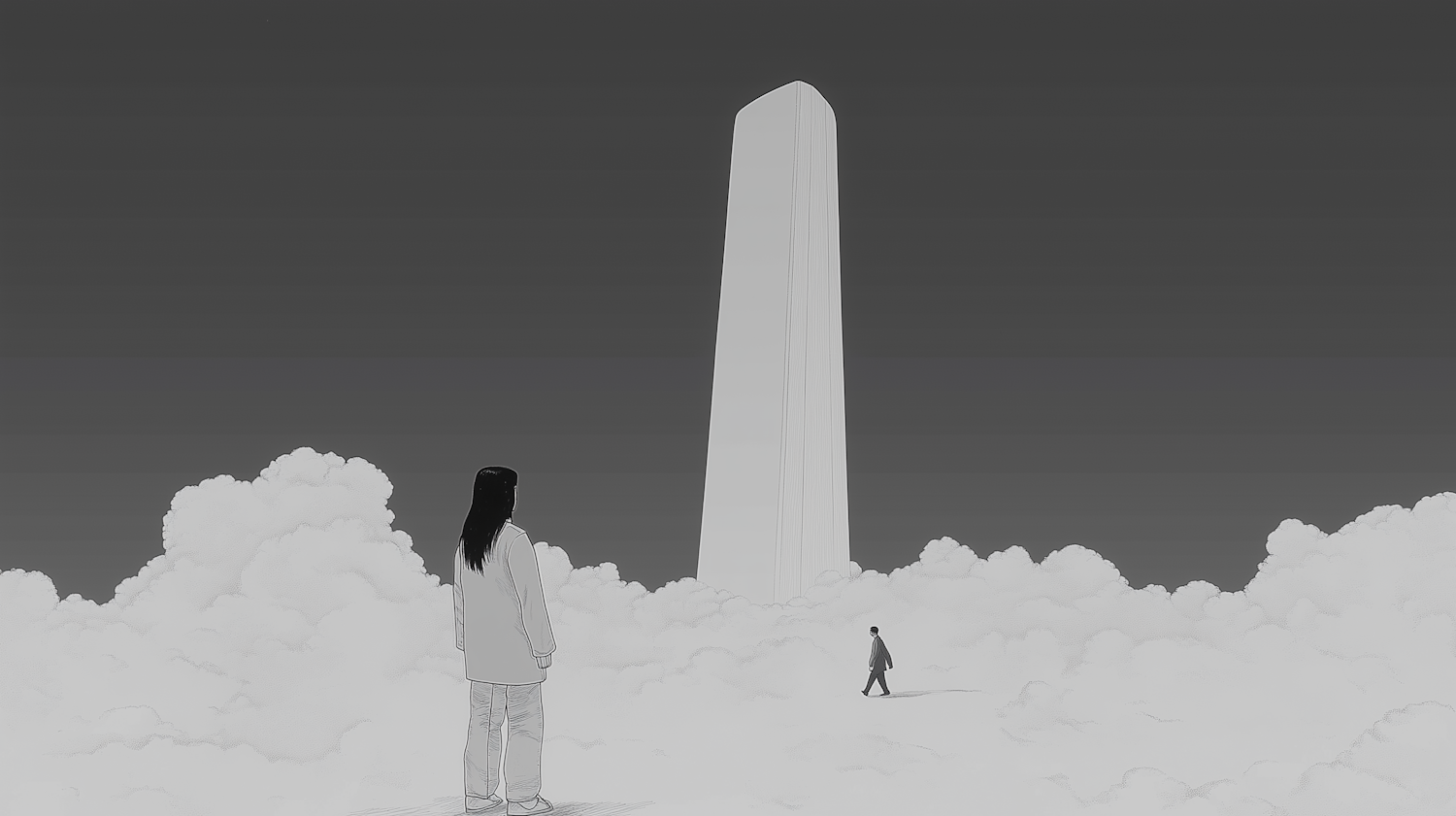 Surreal grayscale illustration of two figures in a cloudscape, approaching a towering monolith under a dark sky.