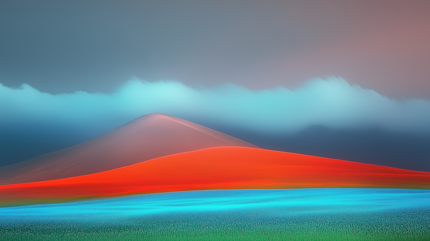Surreal landscape with a vivid red-orange hill, blue-green field, and swirling clouds, creating a dreamlike and abstract atmosphere.