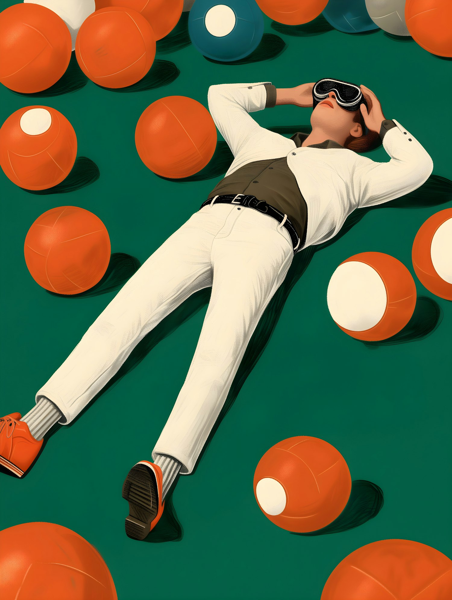 A whimsical illustration of a person in white trousers laying on a green field surrounded by orange and white balls, wearing orange shoes and goggles.