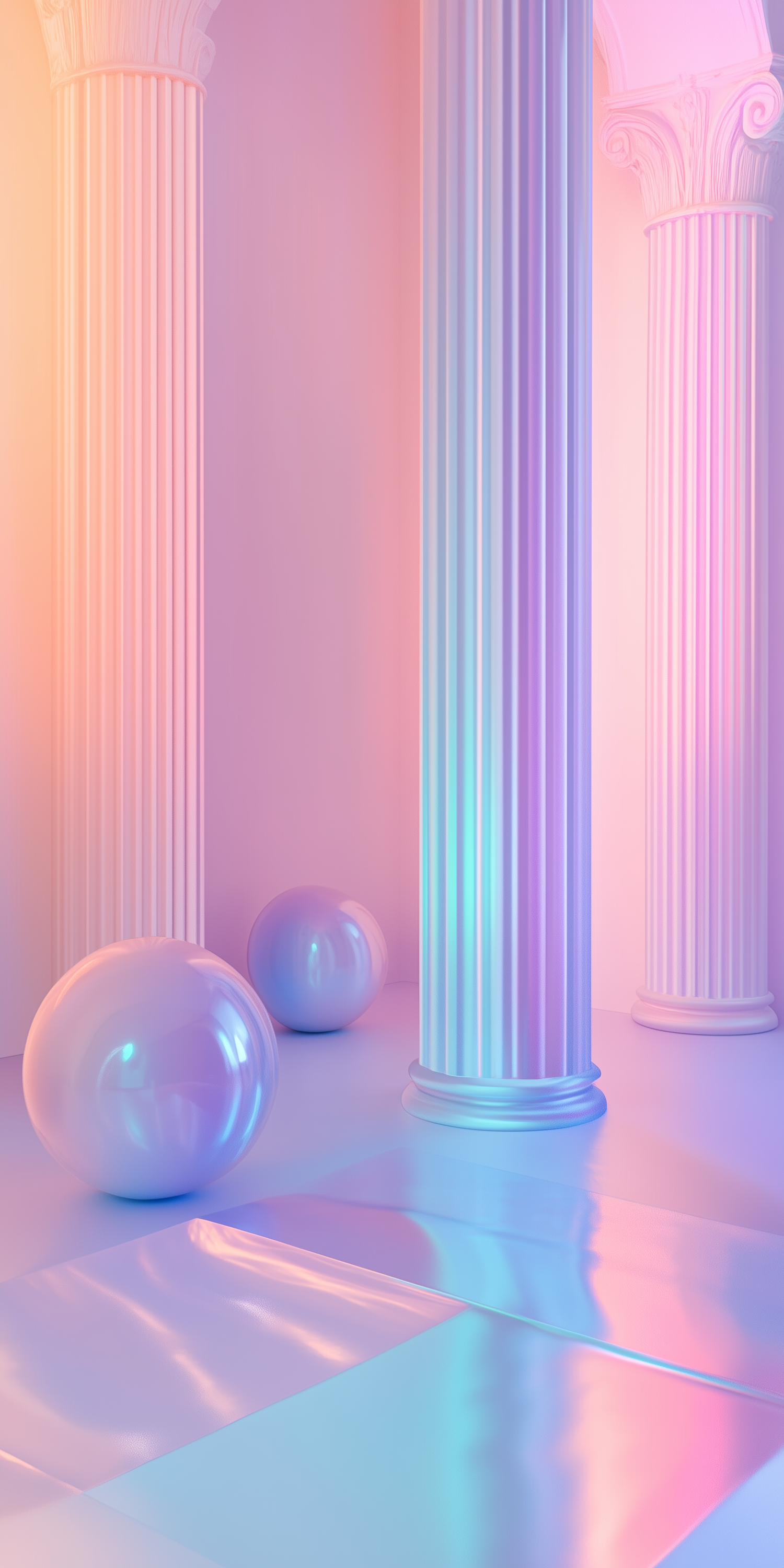 A dreamy pastel scene with classical columns, reflective spheres, and soft pink, purple, and blue lighting for a surreal aesthetic.