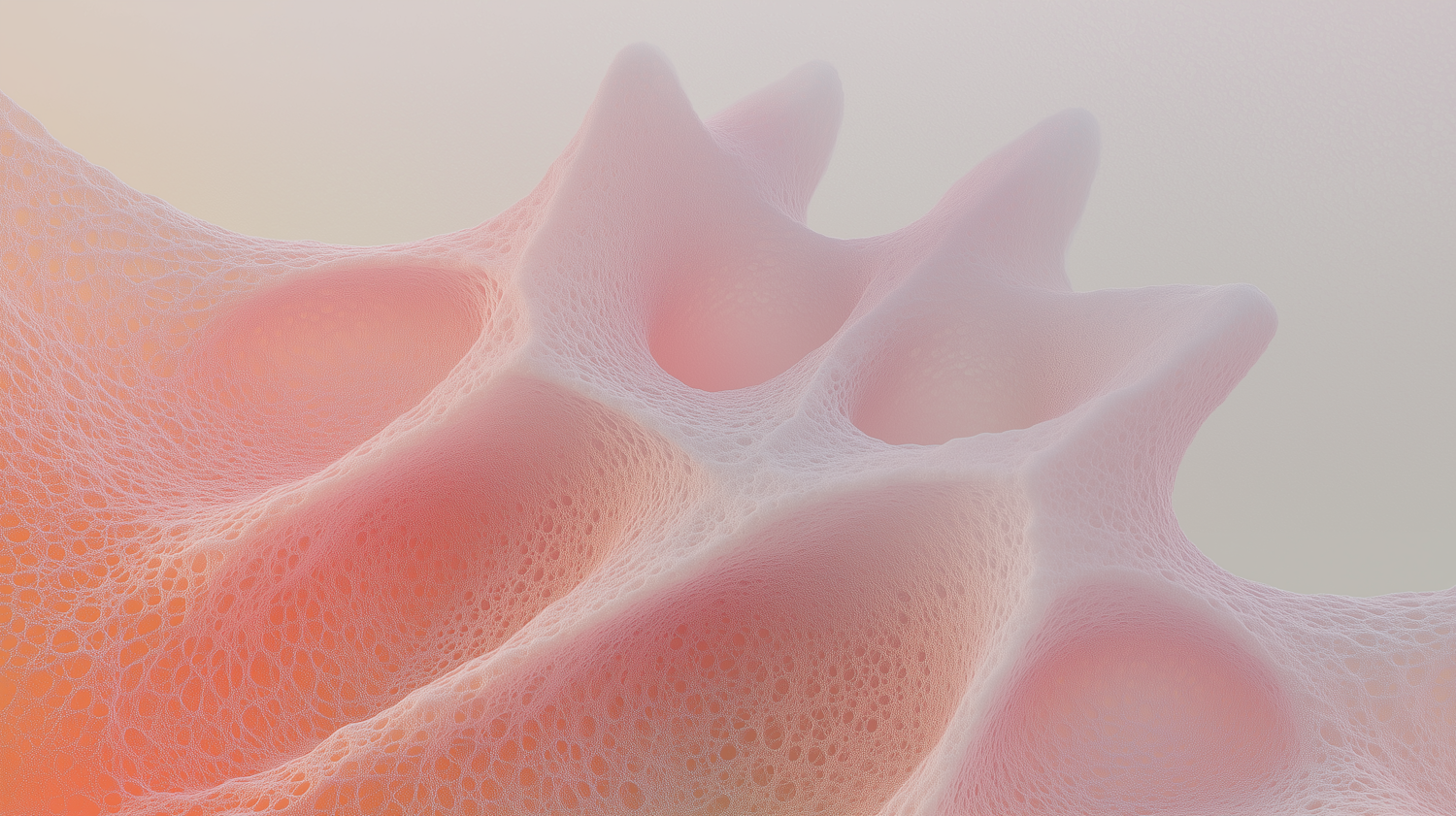 Abstract 3D rendering of a coral-like structure with soft pink hues and intricate web-like textures, creating a surreal organic feel.