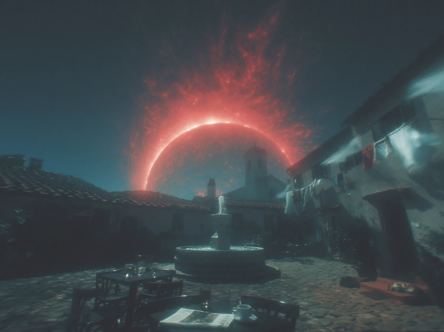 A rustic courtyard with a fountain under a fiery celestial event, blending everyday life with surreal cosmic phenomena.