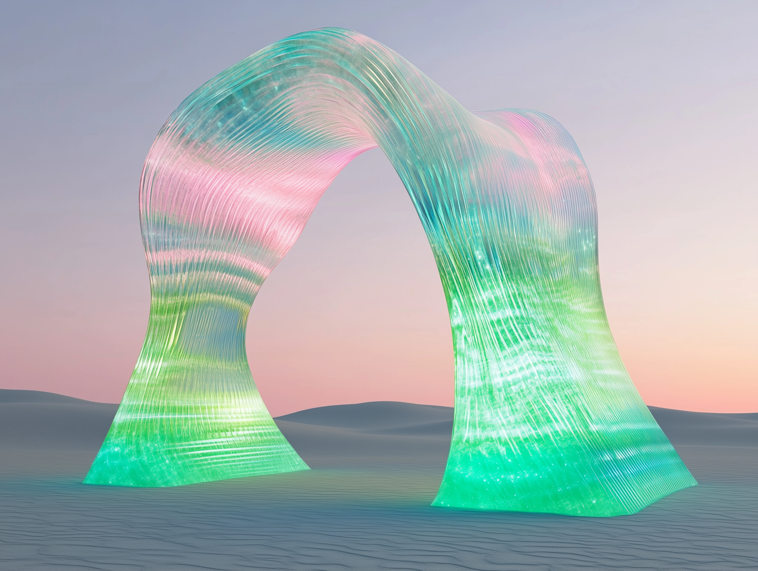 A glowing, pastel-colored arch in a tranquil desert setting, blending green, pink, and blue hues under a soft dawn or dusk sky.