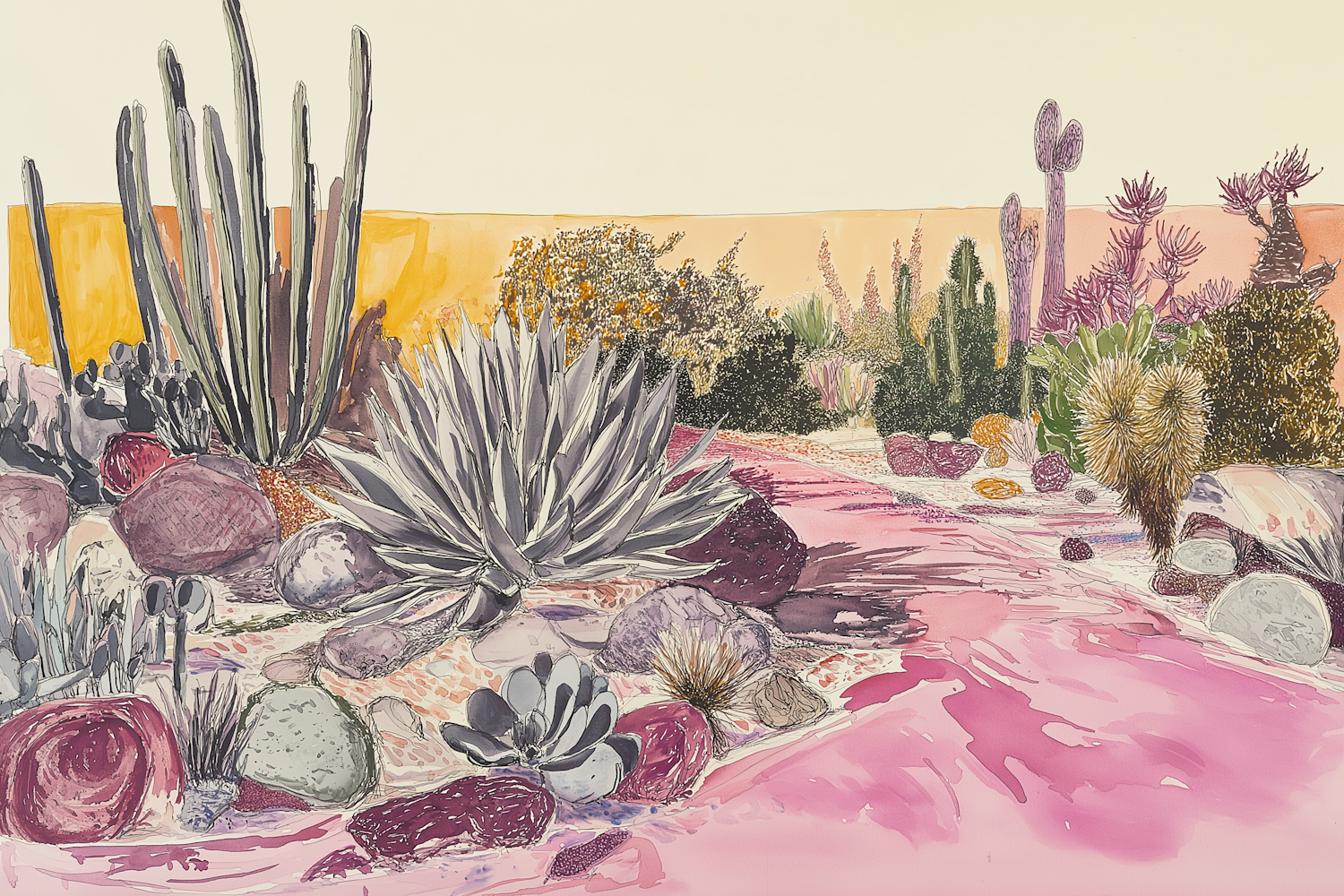 Colorful desert landscape illustration with cacti, succulents, and vibrant pink and orange hues.