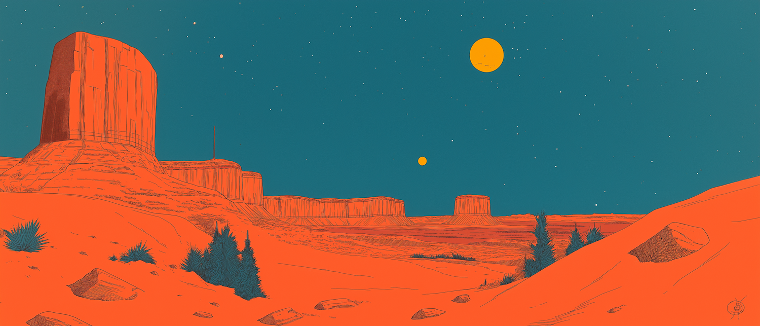Surreal desert landscape with orange mesas under a teal starry sky, featuring two glowing celestial bodies and sparse vegetation.