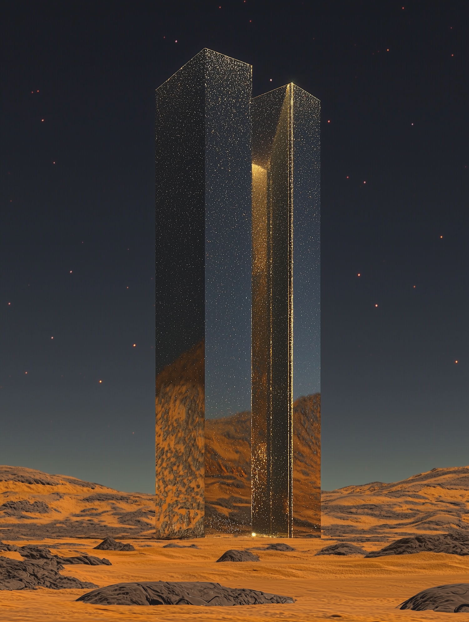 Two towering reflective monoliths rise in a desert under a starry sky, blending metallic elegance with a surreal, otherworldly landscape.